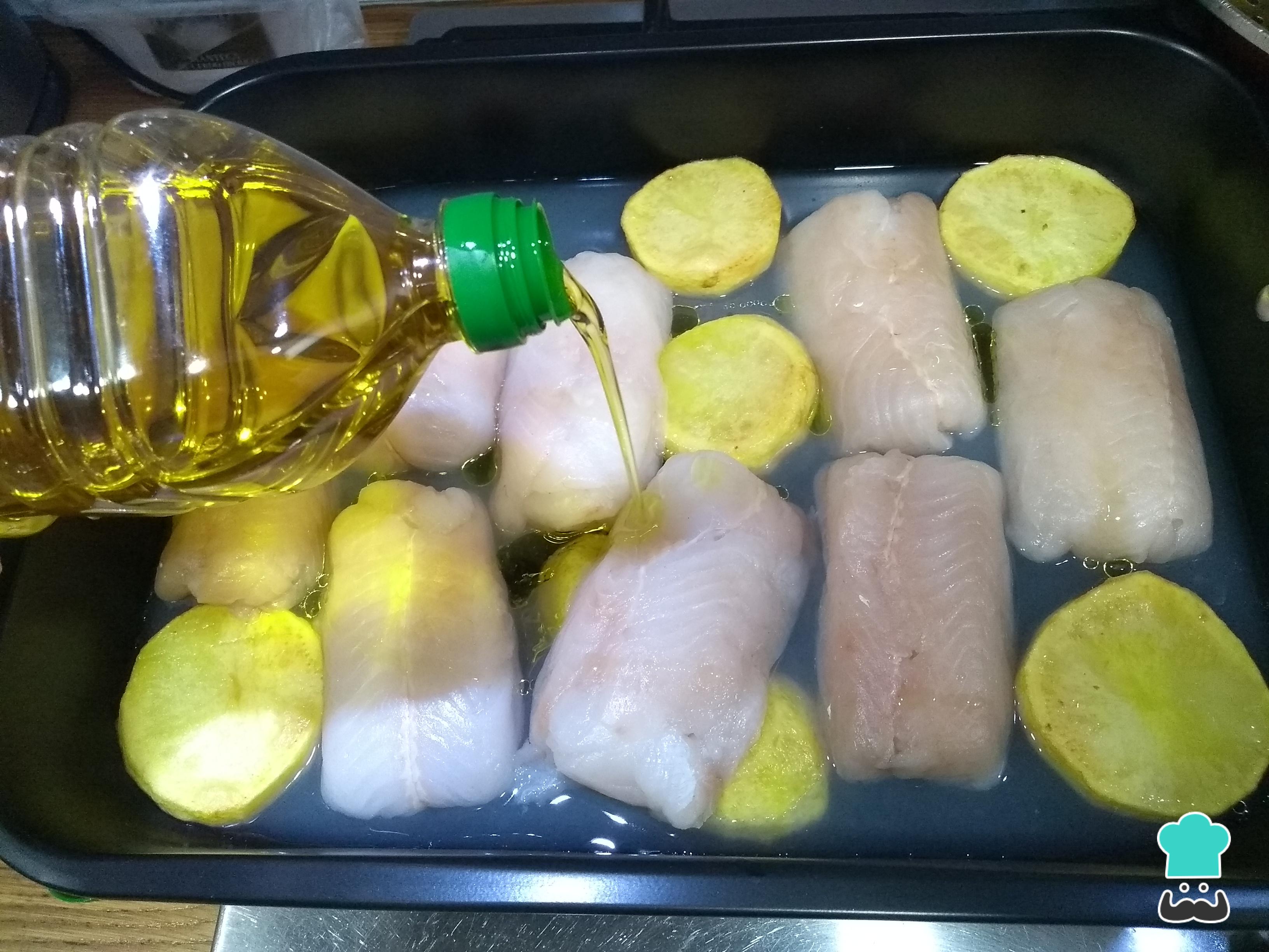Coloca las patatas en una bandeja de horno, vierte el vino blanco y sitúa encima los filetes de merluza sin piel ni espinas.