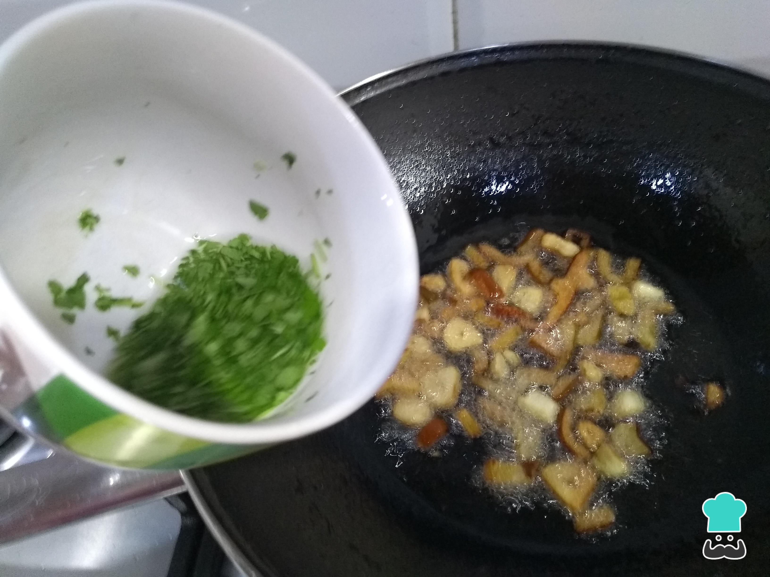 Vuelve a poner al fuego el sofrito de ajos y pimiento. Pica el perejil, mézclalo con el vinagre, añádelo al sofrito y deja que hierva durante 1 minuto. Después, apaga el fuego.
