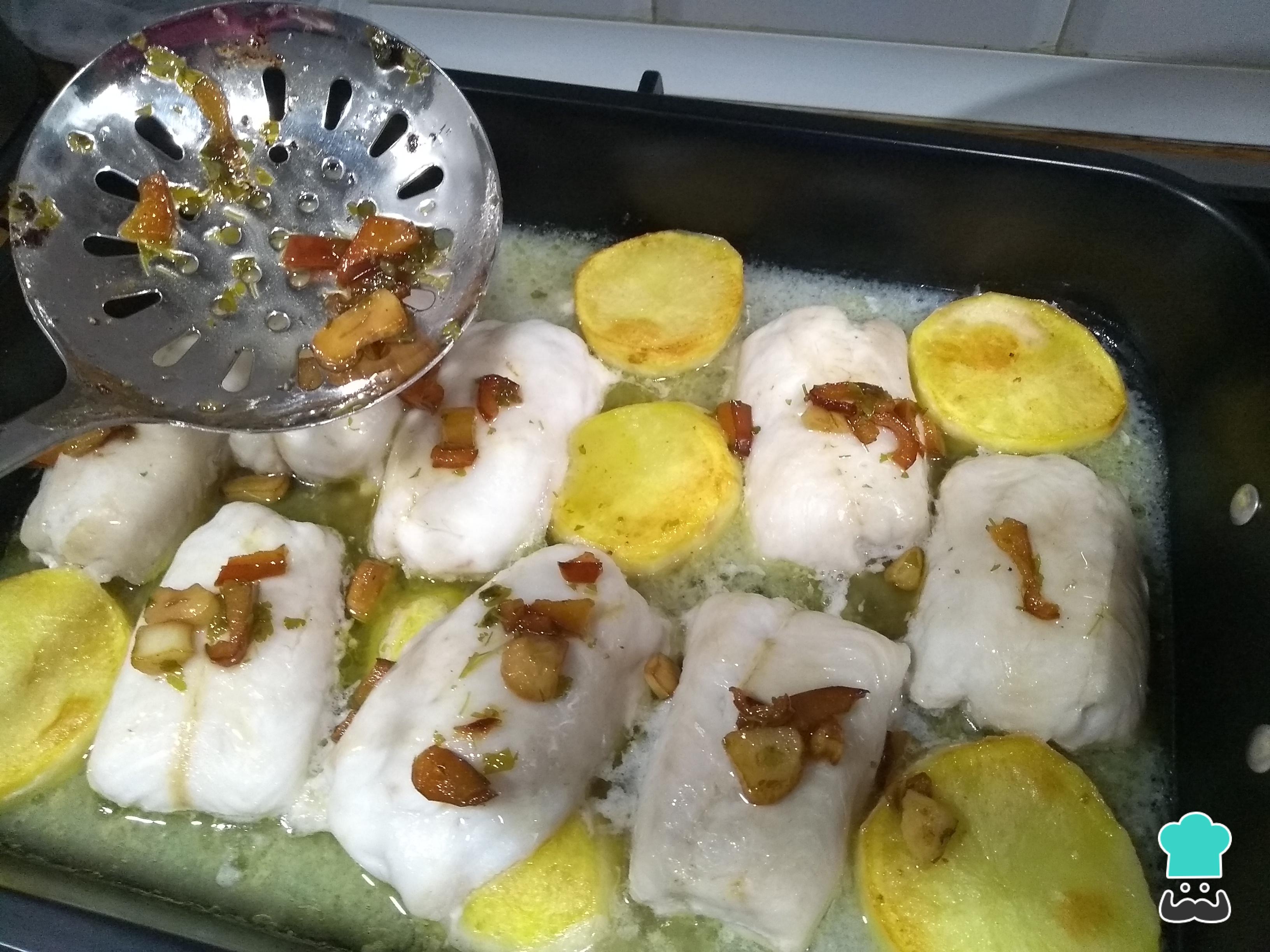 Pasados los 15 minutos de cocción de la merluza, distribuye sobre ella el sofrito anterior, añade unos pellizcos de sal por encima y cocina la merluza al orio 10 minutos más. Vigila el horno para que no se quede sin jugo.