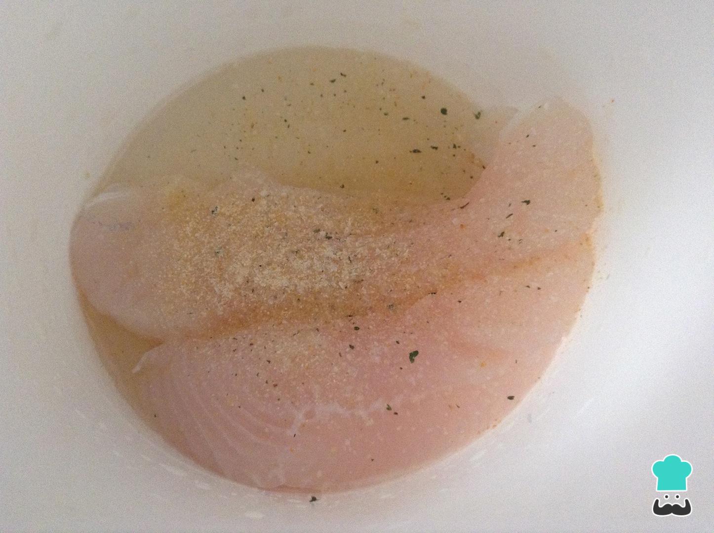 En un bol adiciona los filetes de merluza, agrega el ajo en polvo, la cebolla en polvo y un poco de vino blanco. Deja marinar en el refrigerador durante una hora aproximadamente.