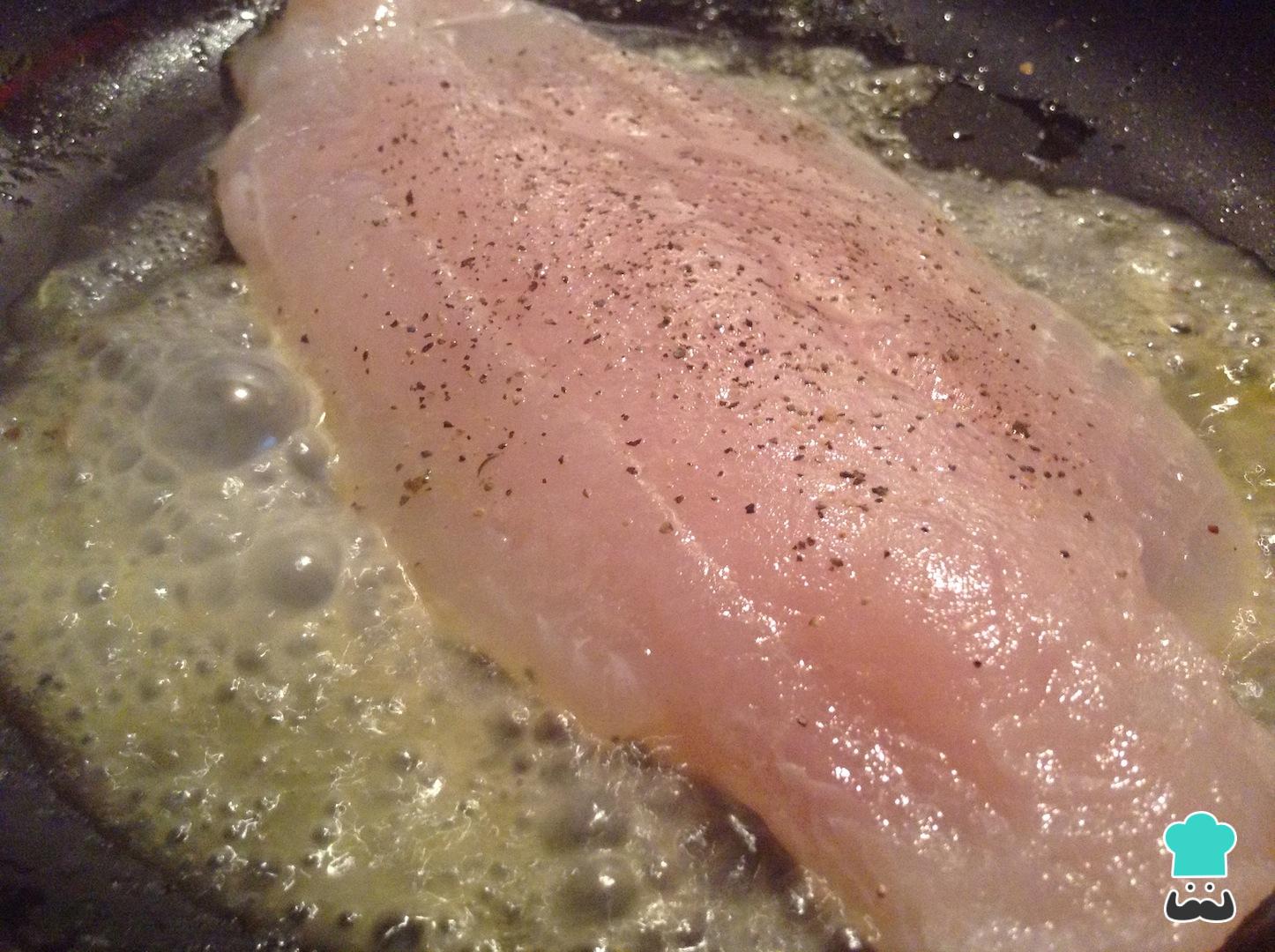 Una vez caliente, agrega cada uno de los filetes de merluza con sal y pimienta para cocinarlos.