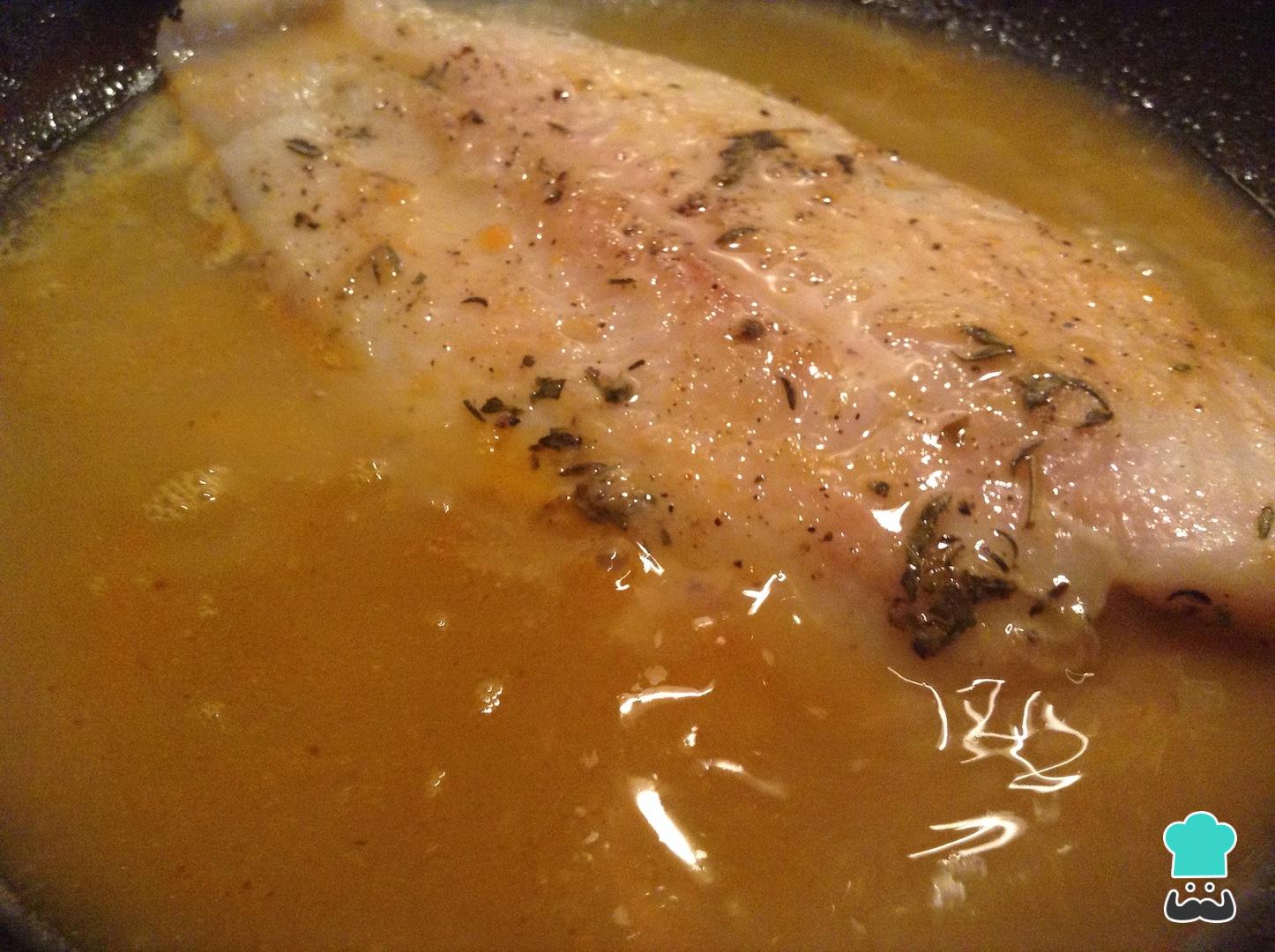 Dale la vuelta al filete de merluza y, una vez observes que la cocción del pescado está en el punto deseado, añade la salsa americana a al sartén y deja conservar a fuego bajo durante 3-4 minutos más. Consulta la receta de la salsa americana casera y hazla tú mismo.