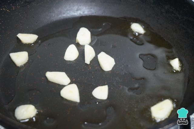 Empieza la receta de merluza con pimientos del piquillo por la salsa. Para ello, calienta una sartén con un chorro de aceite y, mientras tanto, pela y corta los ajos en rodajas. Una vez caliente, saltea los ajos a fuego medio y vigilando que no se quemen.