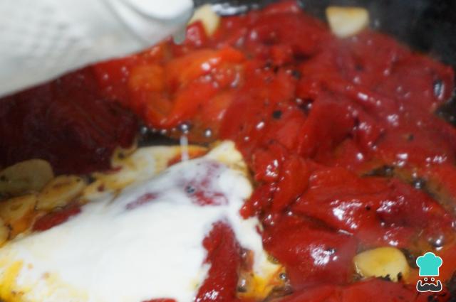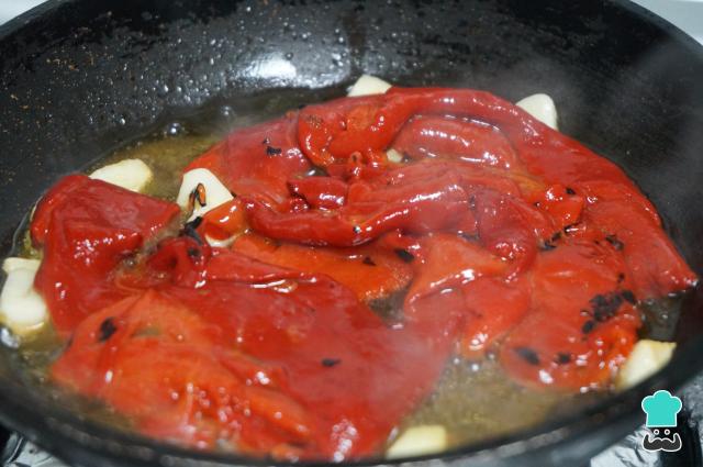 Antes de que se doren, añade los pimientos del piquillo y deja que se cocinen durante 5 minutos aproximadamente. Luego, agrega sal al gusto y un poco del que traían los pimientos en el bote.