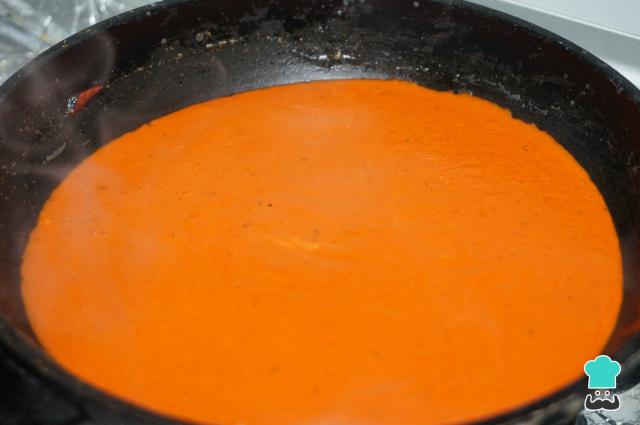 Incorpora la crema de leche (nata de cocinar) y deja que se cocine todo junto otros 5 minutos. Si ves que se seca mucho la salsa, añade un poco más del agua de los pimientos o de caldo de verduras. Si prefieres hacer una receta más saludable, puedes sustituir la crema de leche por leche evaporada.