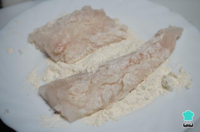 Limpia y corta la merluza en rodajas o en filetes, preferiblemente sin espinas. Sala el pescado y pasa los trozos por harina para que quede con un toque crujiente por fuera. Nosotros hemos optado por hacer merluza rebozada en salsa de piquillos, pero también puedes cocinarla al horno sin necesidad de pasarla por harina.