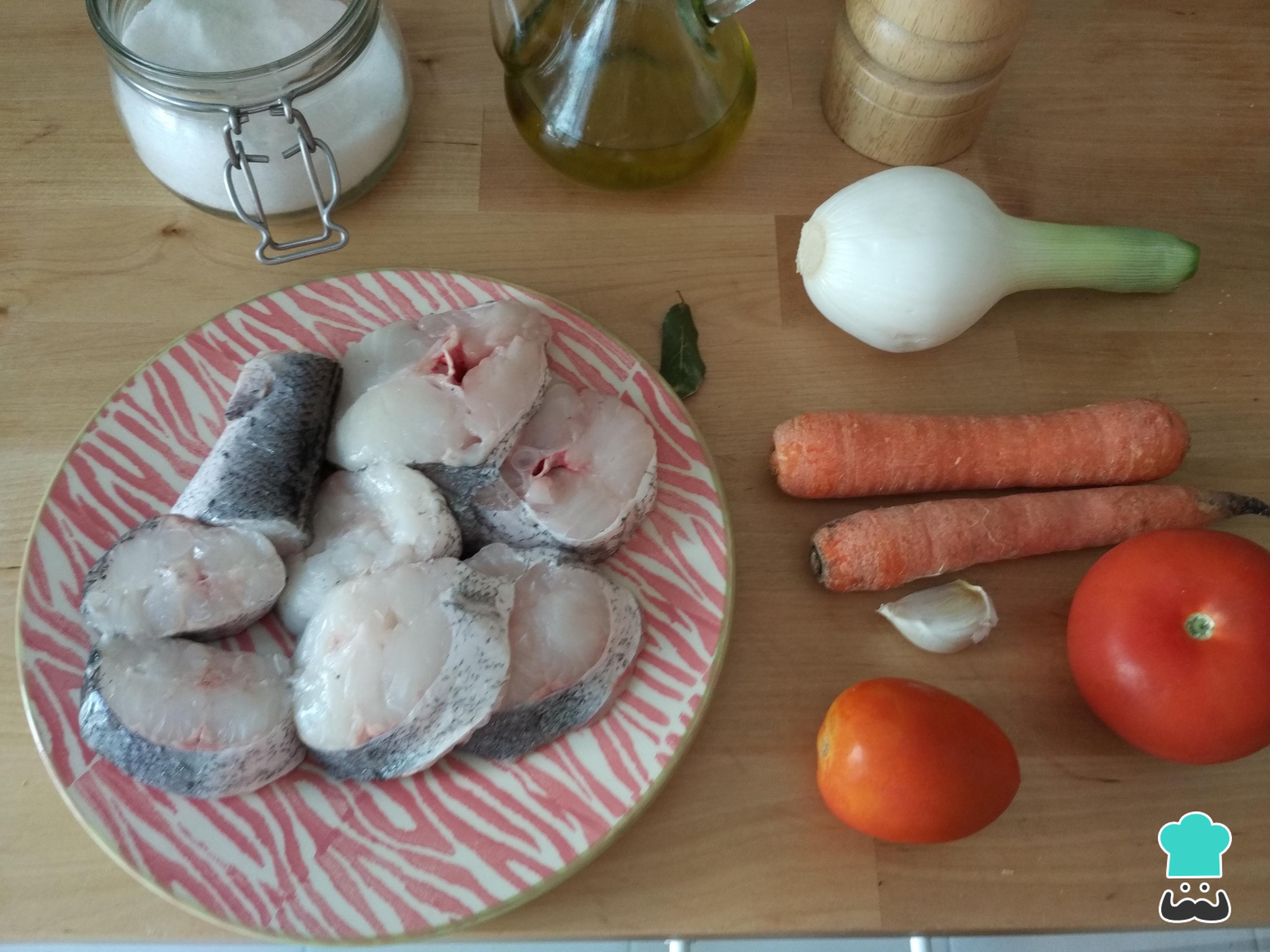 Reunimos todos los ingredientes para elaborar la merluza en salsa de zanahoria.