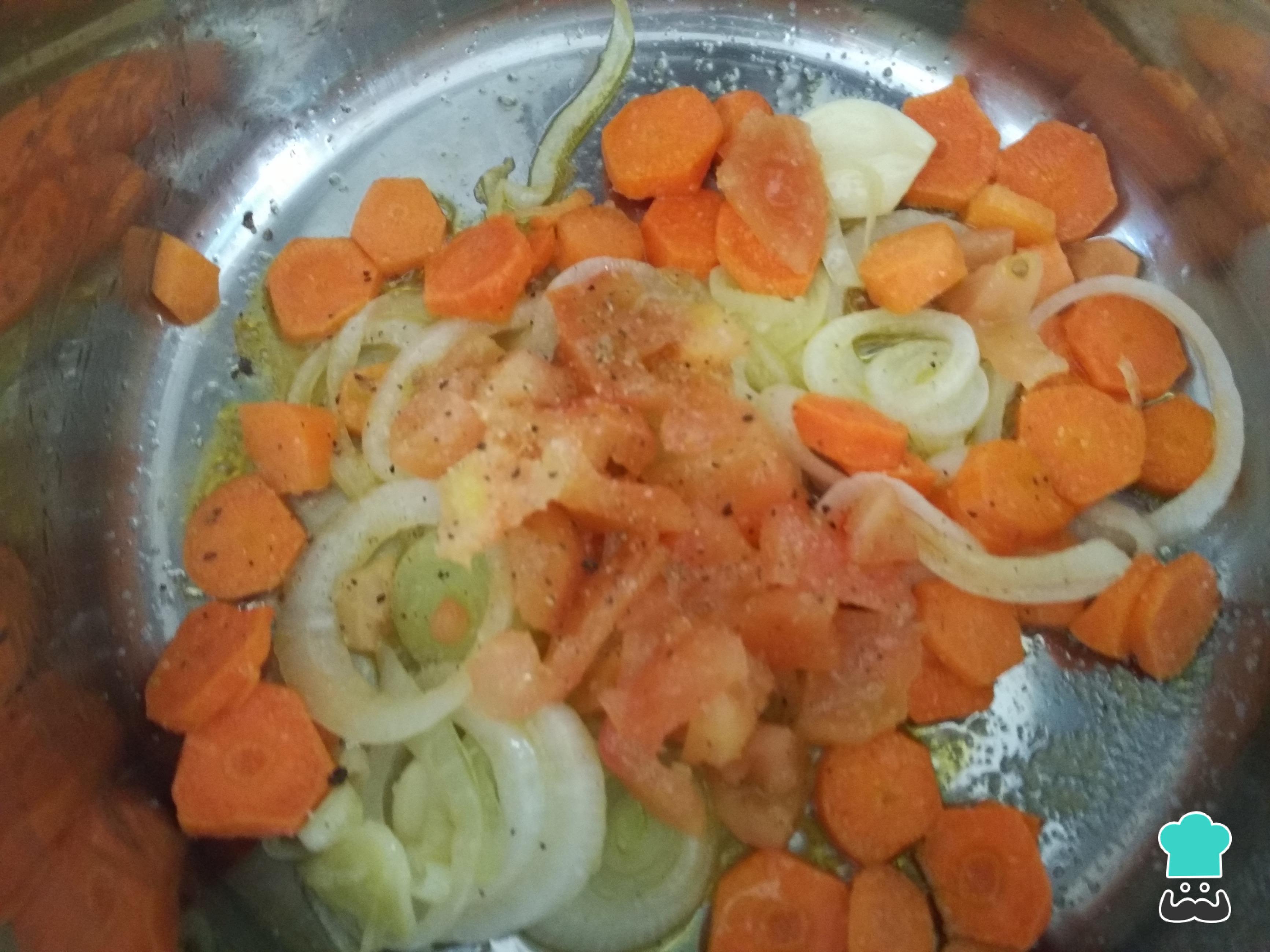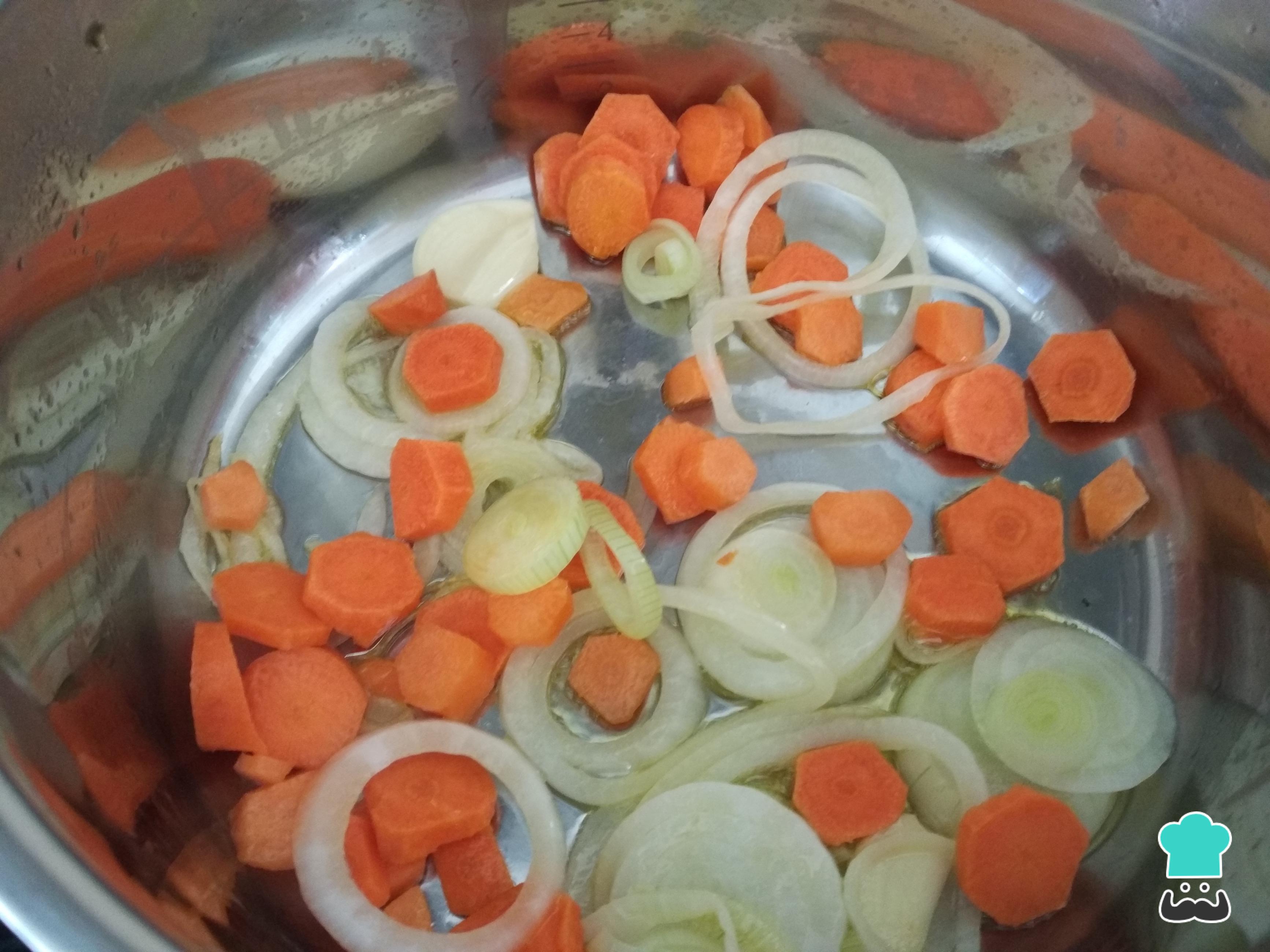 Para empezar a preparar la salsa para pescado, sofreímos la cebolla cortada en juliana y la zanahoria cortada en rodajas en una olla con aceite de oliva. Dejamos que se dore durante 3 minutos.