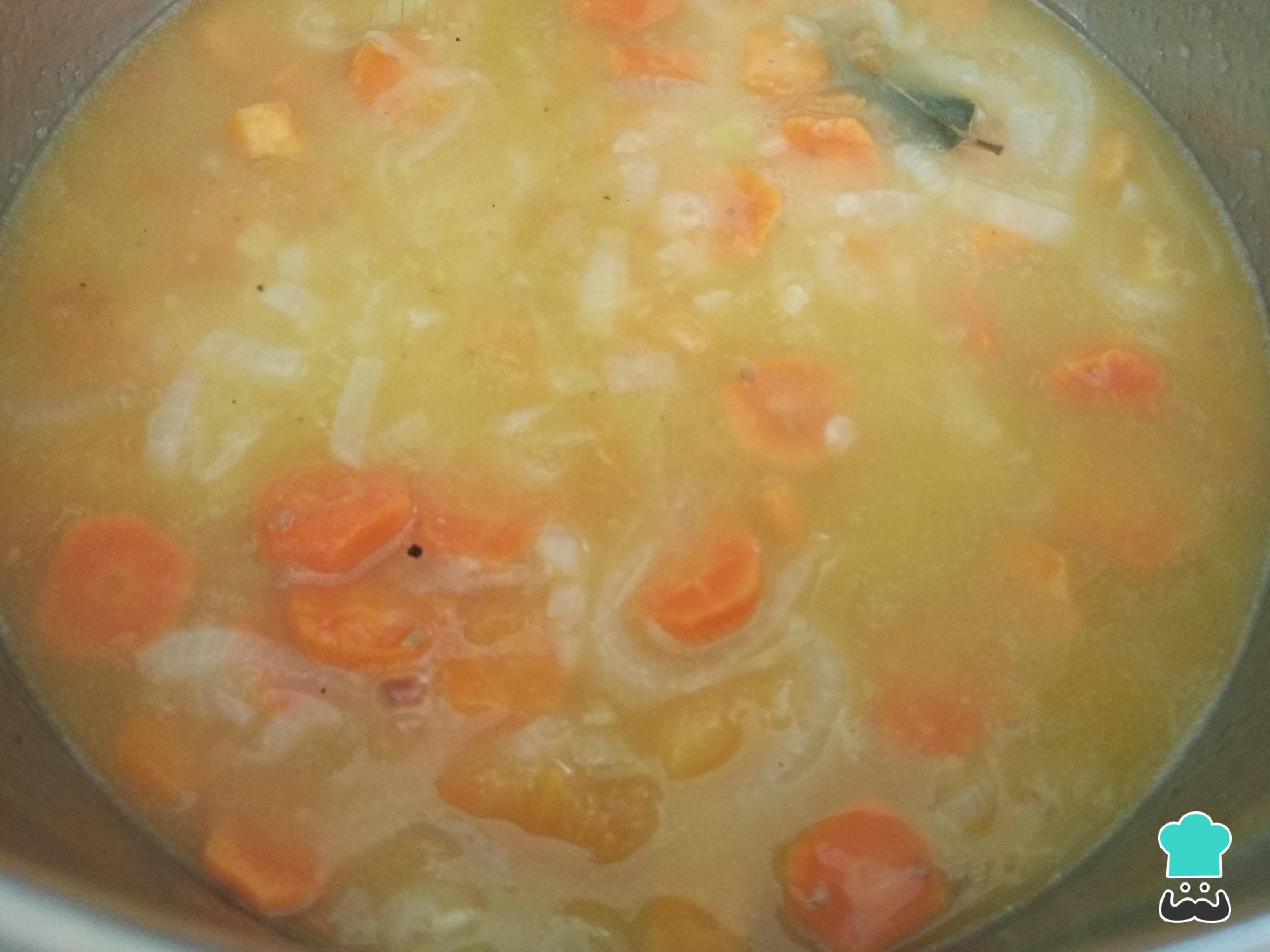 Agregamos 350 mililitros de agua o fumet de pescado. Incorporamos la hoja de laurel y llevamos a ebullición la salsa de zanahoria. Para que la salsa espese podemos añadir un poco de harina de maíz disuelta en agua fría.