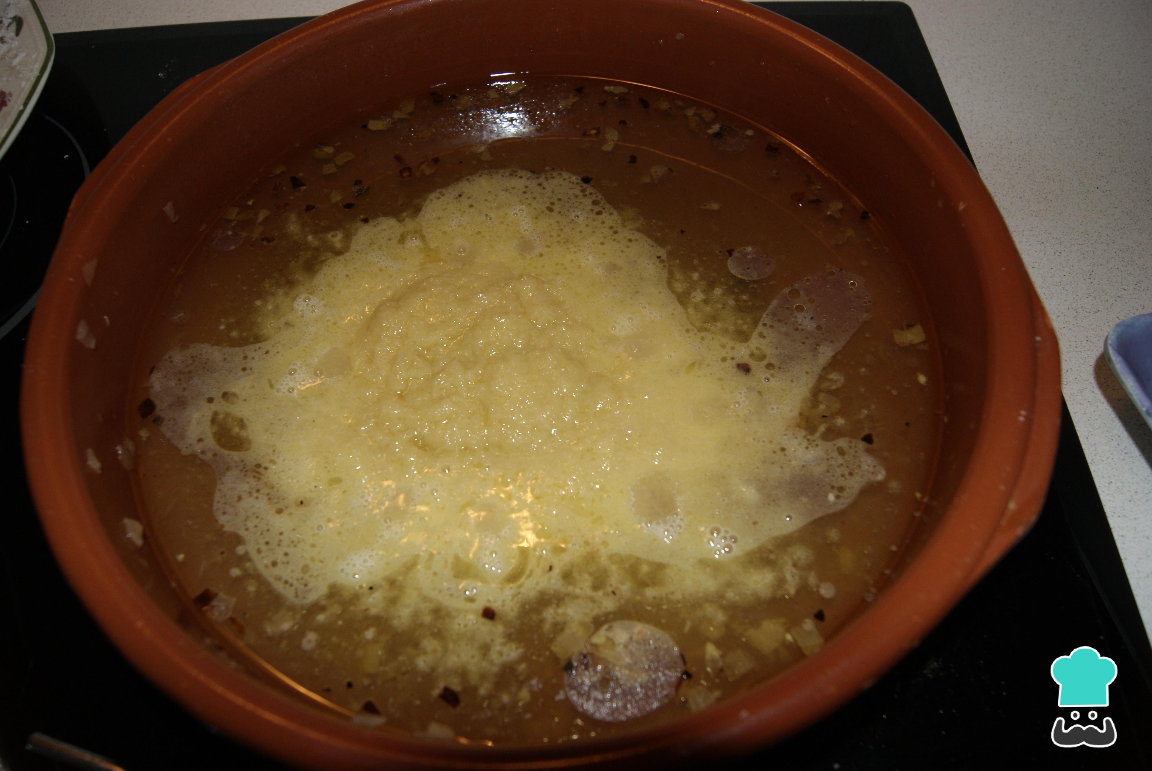 Escurrimos las almejas y reservamos el caldo en la misma cazuela con el sofrito triturado, a fuego alto.