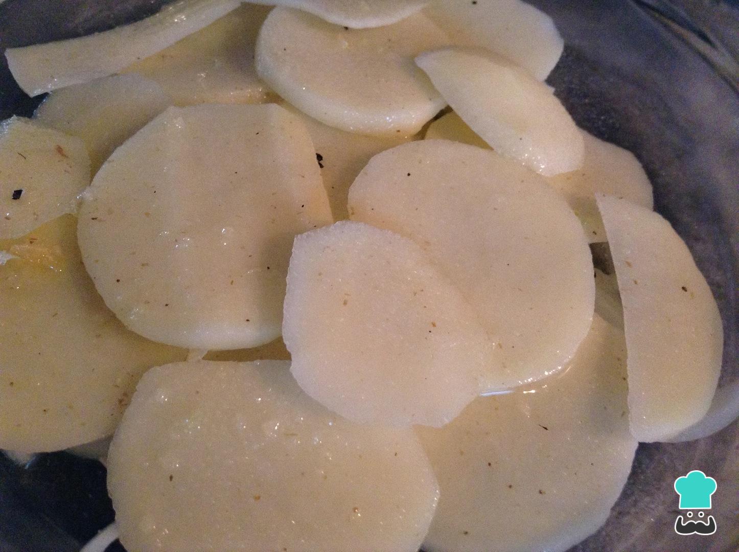 Pela las patatas y córtalas en rodajas no muy gruesas, ponlas en agua para que no se oxiden.