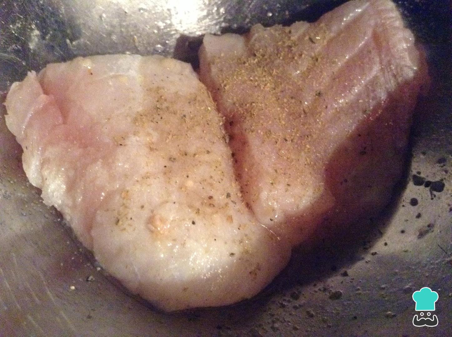 Ahora vamos a preparar el pescado. Para ello, corta en filetes individuales el mero y báñalos en la mezcla que preparaste en el paso tres de limón, sal y pimienta.