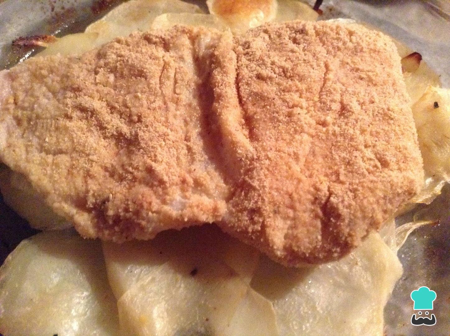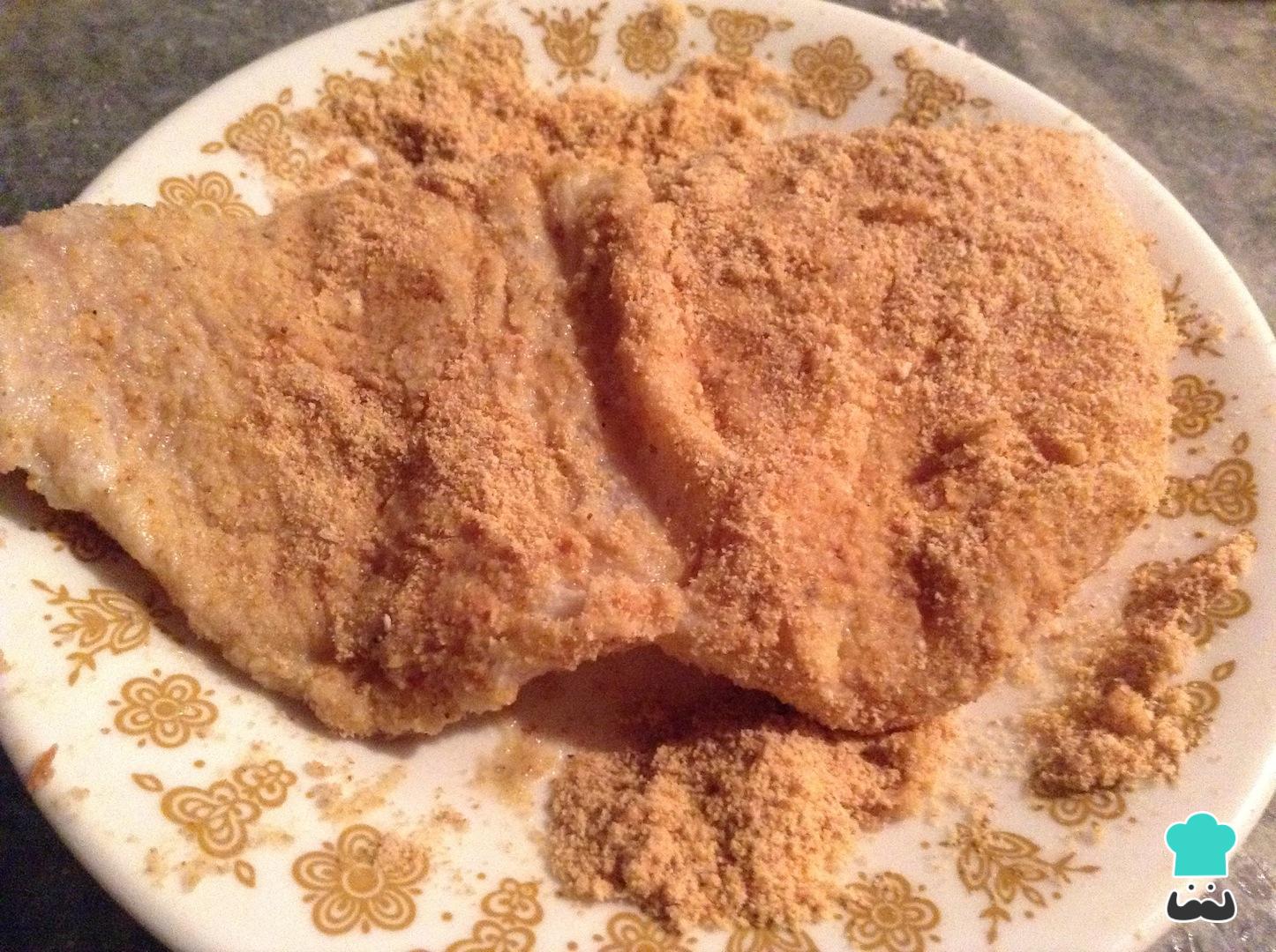 Luego reboza cada uno de los filetes con un poco de miga de pan y reserva.
