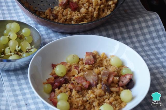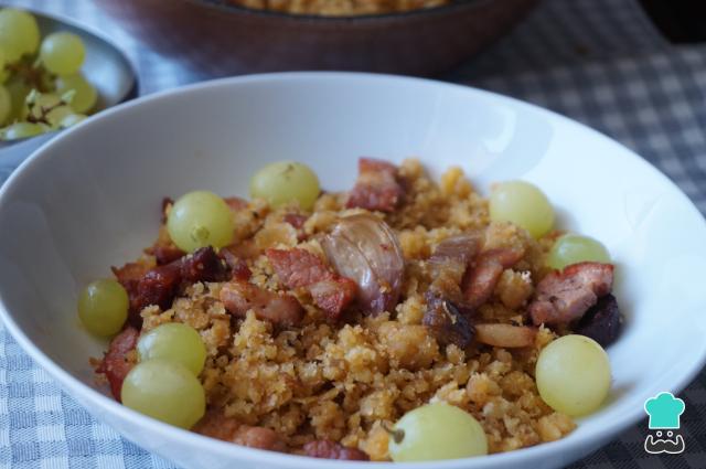 Y cuando estén sirve las migas de pastor en un plato. Puedes añadir luego las uvas y la carne. También puedes poner todo junto en una fuente para que cada quien se sirva al gusto.