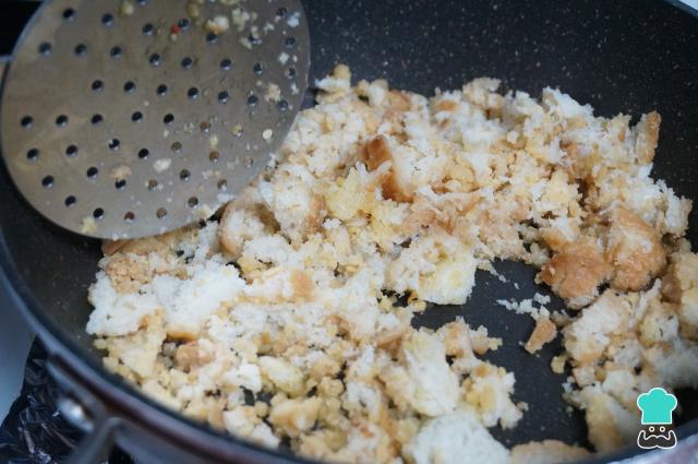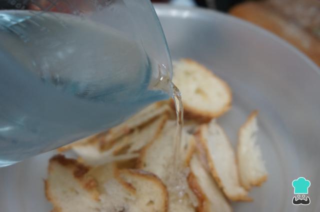 Corta el pan en rodajas muy finas, ve poniéndolo en un bol hondo y añade agua poco a poco para empapar el pan. Ve removiendo para que todo el pan quede ligeramente húmedo. Solo es necesario que se ablande y no quede muy mojado para que no termine siendo una papilla.