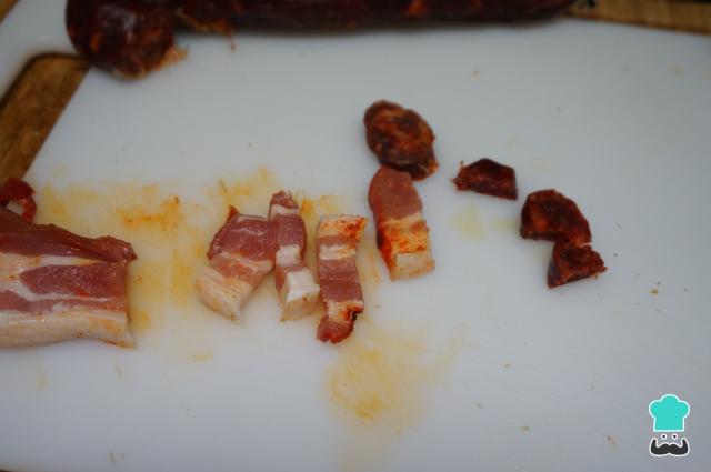Corta la panceta y el chorizo en trozos. Pela los dientes de ajo y déjalos enteros.