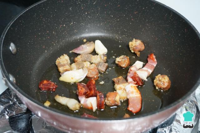 En una sartén honda pon un buen chorro de aceite y añade los ajos, el chorizo y la panceta. Sofríe todo, saca y reserva.