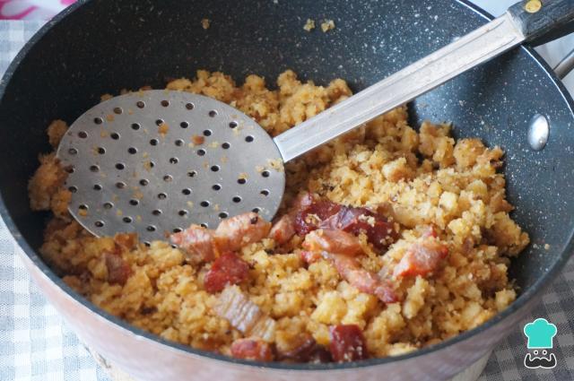 En la misma cazuela con el aceite de freír, añade las migas de pan remojado y, con ayuda de la espátula, ve moviendo y dándole vueltas al pan. Irá soltando toda la humedad y cocinándose.