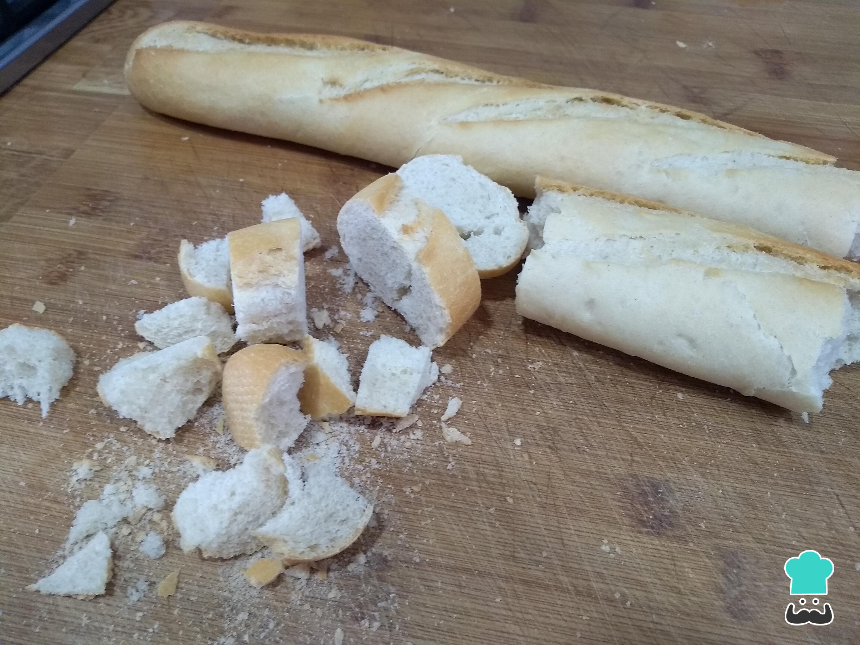 Desmiga el pan a mano o con un cuchillo de sierra. Intenta que el pan no se deshaga, simplemente haz trozos de tamaño pequeño y resérvalos en un recipiente.