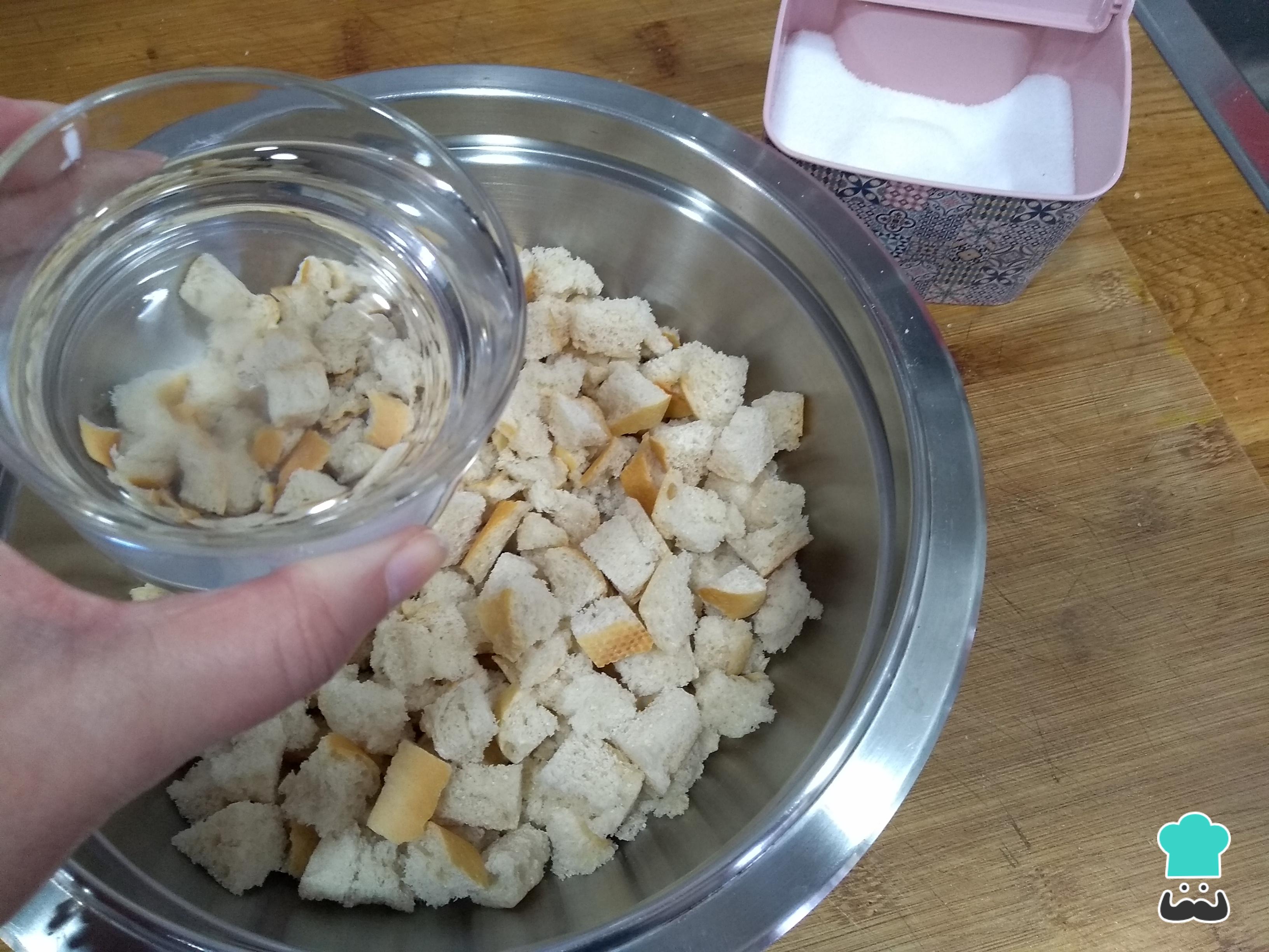 Añade un punto de sal al pan recién troceado, remueve para que se reparta por todo y humedece el pan añadiendo agua poco a poco. Remueve con las manos y no lo dejes totalmente empapado, solo debes humedecerlo.