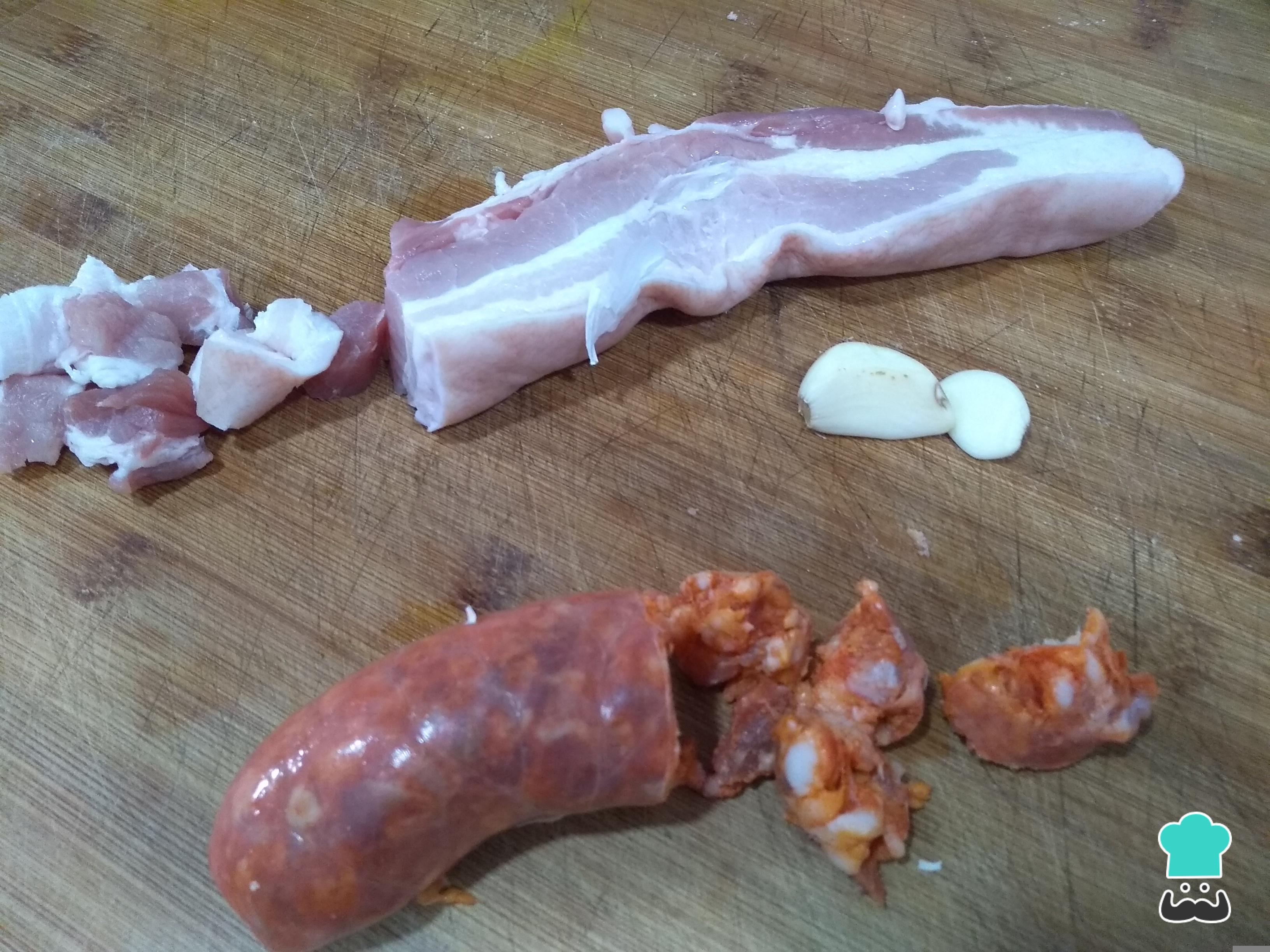 Corta la panceta y el chorizo en trozos pequeños y lamina los dientes de ajo. Puedes añadir más cantidad de estos ingredientes a tus migas de pastor, todo dependerá del número de comensales. Prepara una sartén honda y grande con aceite de oliva para que se vaya calentando.