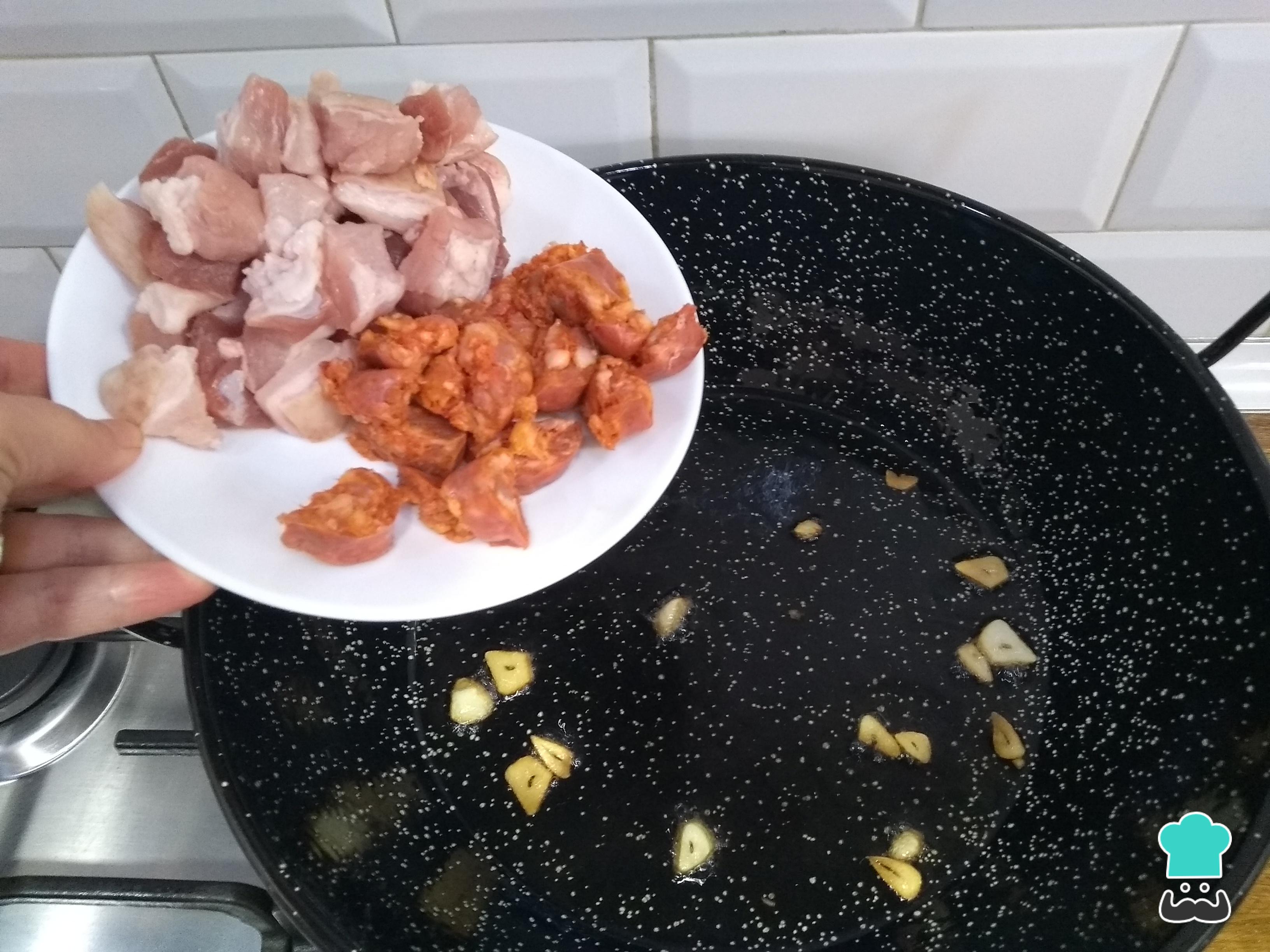 Rehoga un poco las láminas de ajo y cuando tomen un color dorado añade los pedazos de carne. Cocina a fuego bajo durante un periodo de 4 minutos sin dejar de remover para evitar que se tuesten demasiado estos ingredientes.
