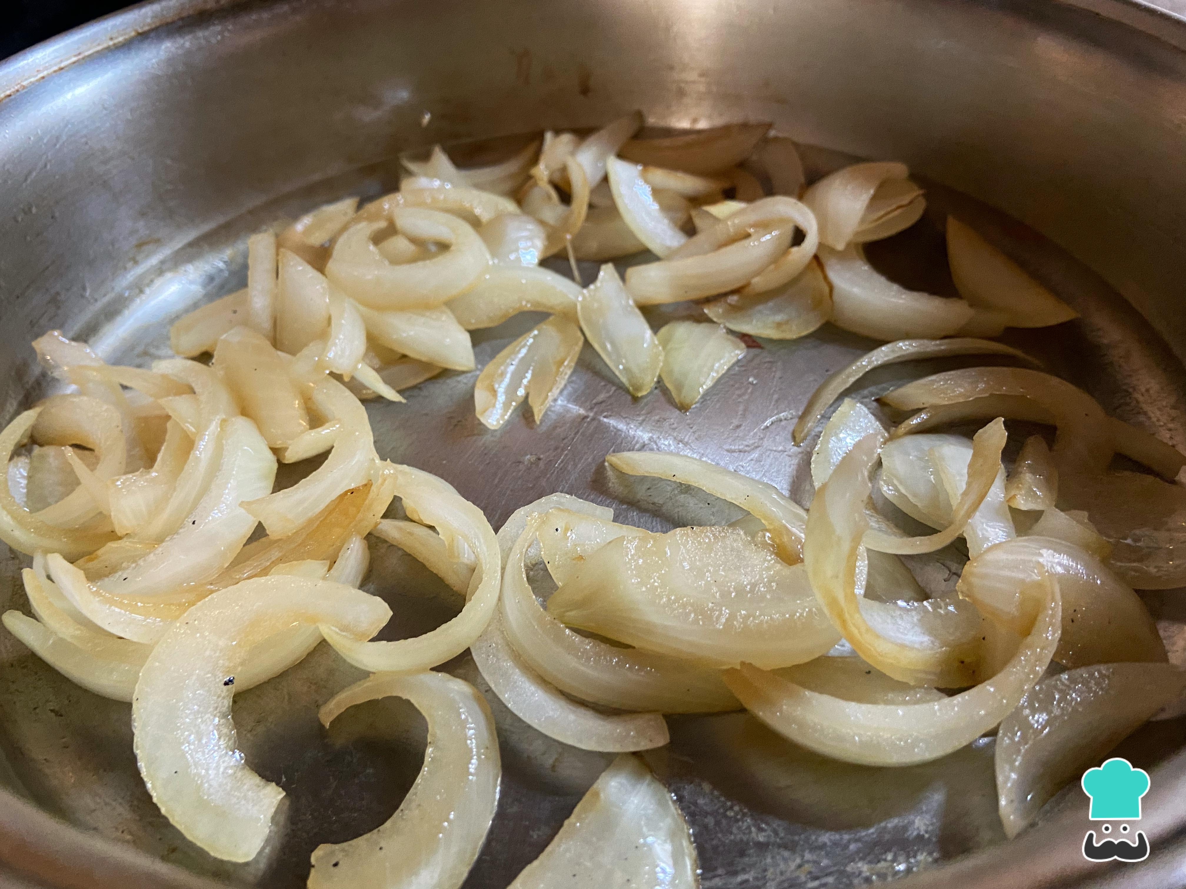 Mientras se cocina la carne, prepara la cebolla. Para ello, pélala y córtala en forma de pluma, como ves en la imagen. Llévala a la sartén caliente con 1 cucharadita de aceite y 1 de manteca. Cuando esté transparente, baja el fuego al medio y aguarda a que se dore. En ese momento, vuelve a subir el fuego a máximo y agrega el vino o whisky. Cuando se evapore el alcohol y ya no tenga olor ácido, retíralas del fuego.