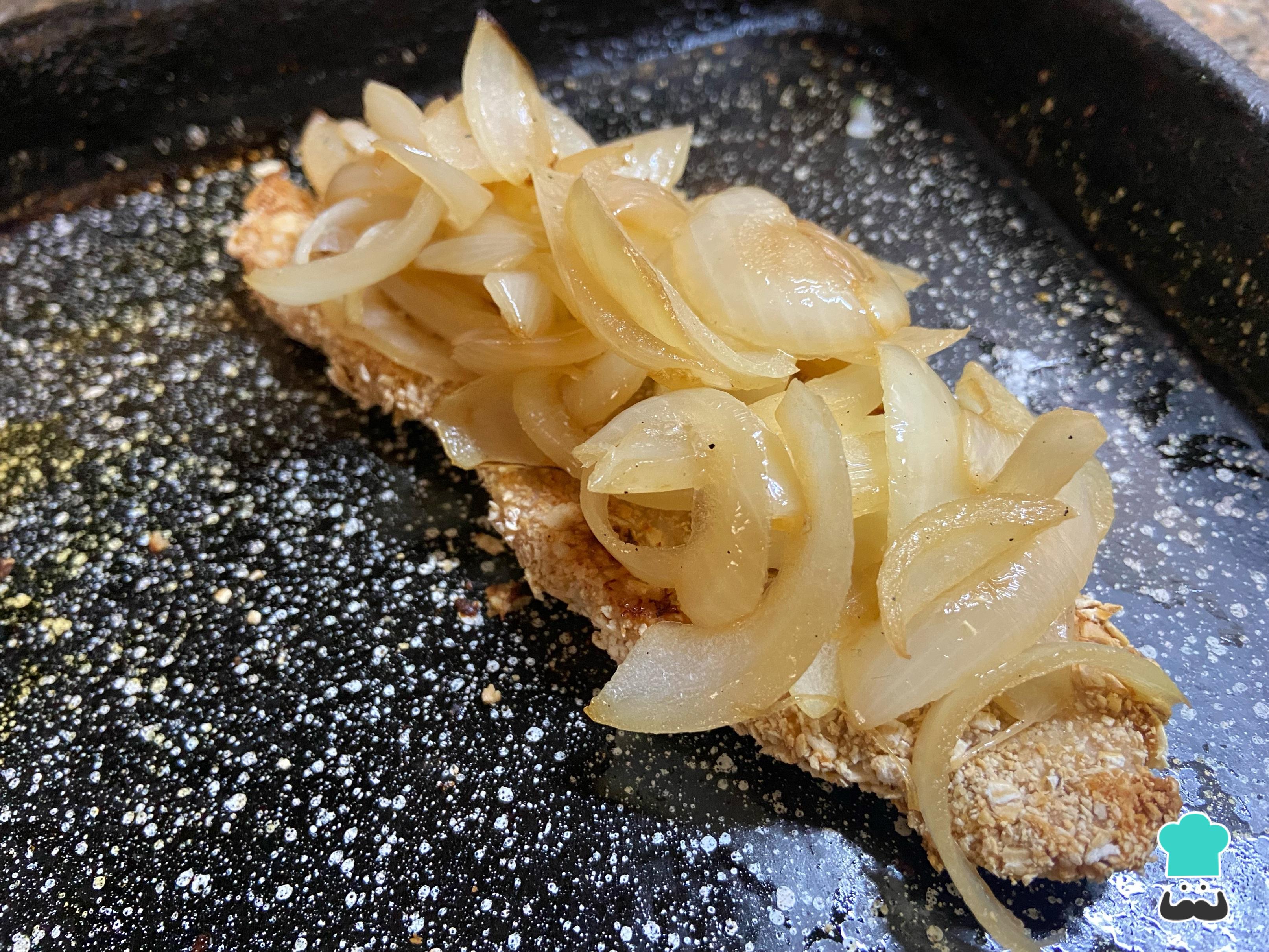 Pasados los 7-10 minutos de cocción de las milanesas, retíralas del horno para darles la vuelta y agregarles el queso y la cebolla que salteaste en el punto anterior. Seguido, llévalas al horno nuevamente durante 5-7 minutos más. Si las doraste en fritura, llévalas a una asadera para completar la cocción en el horno con estos últimos ingredientes.