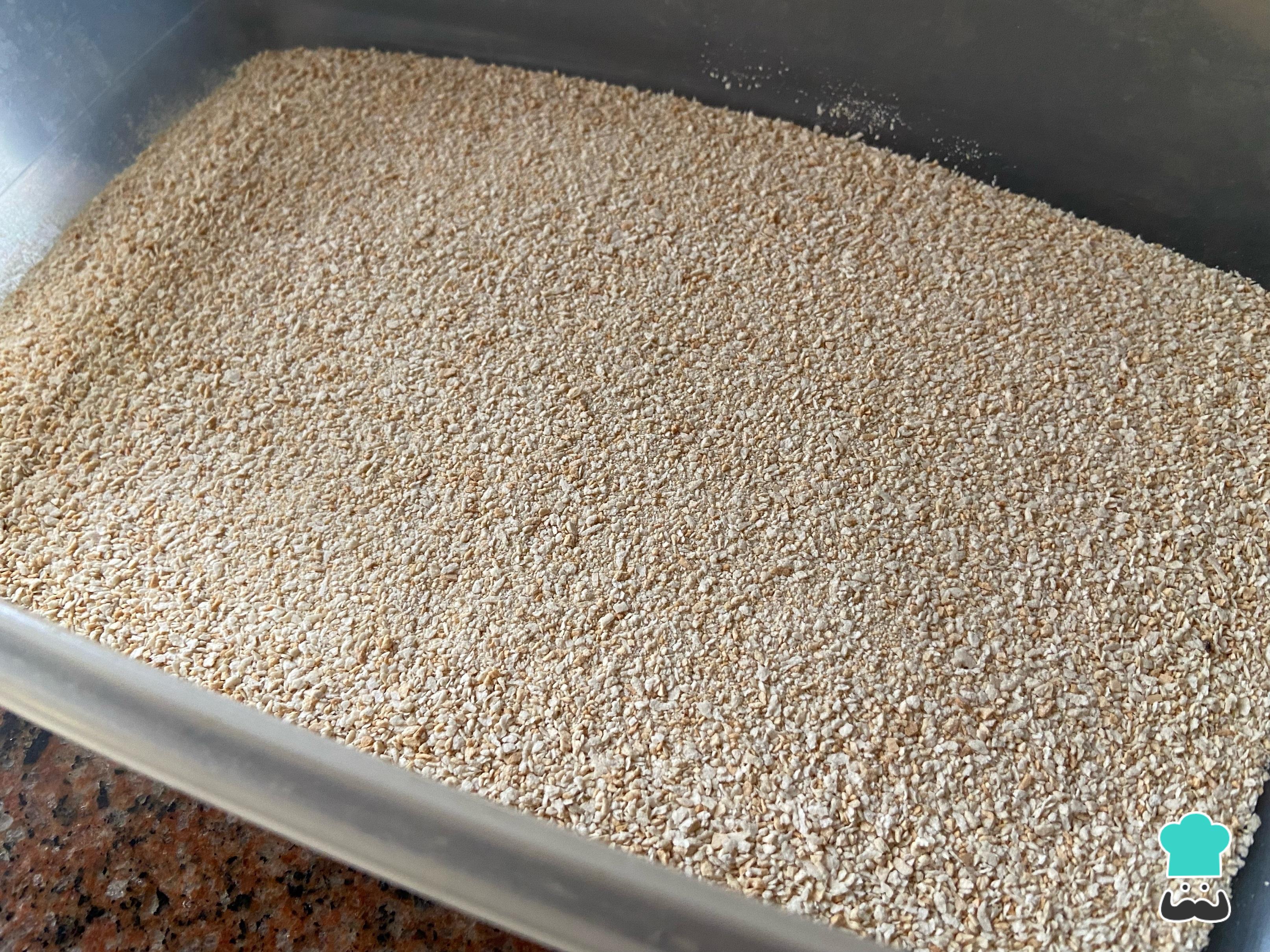 Prepara el pan rallado en un recipiente amplio. Puedes mezclarlo o bien reemplazarlo por avena, polenta, copos de maíz procesados o panko. También puedes agregar semillas. A continuación, enciende el horno a temperatura máxima.