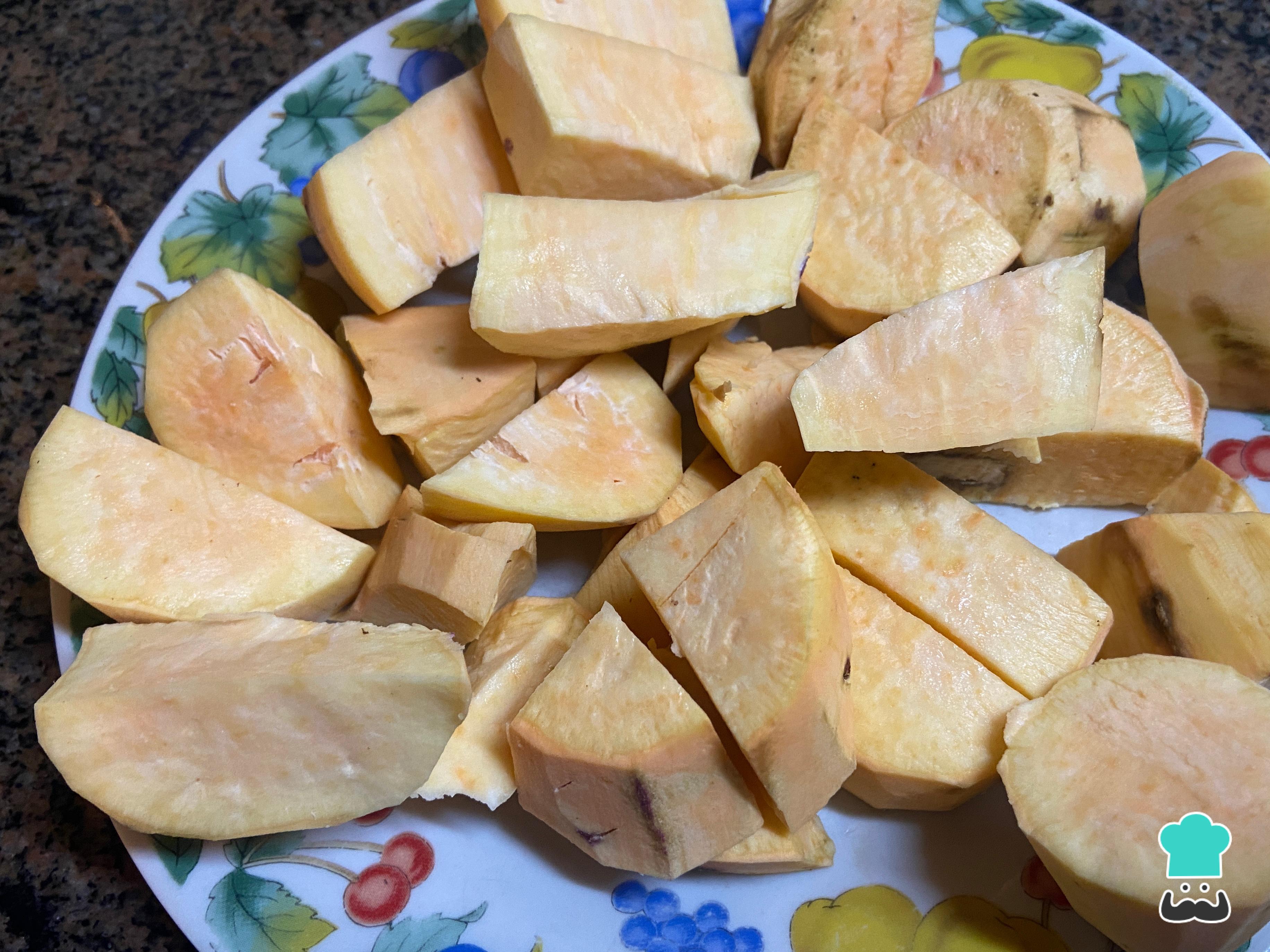 Mientras, pela y corta las batatas en cubos medianos para elaborar el acompañamiento.