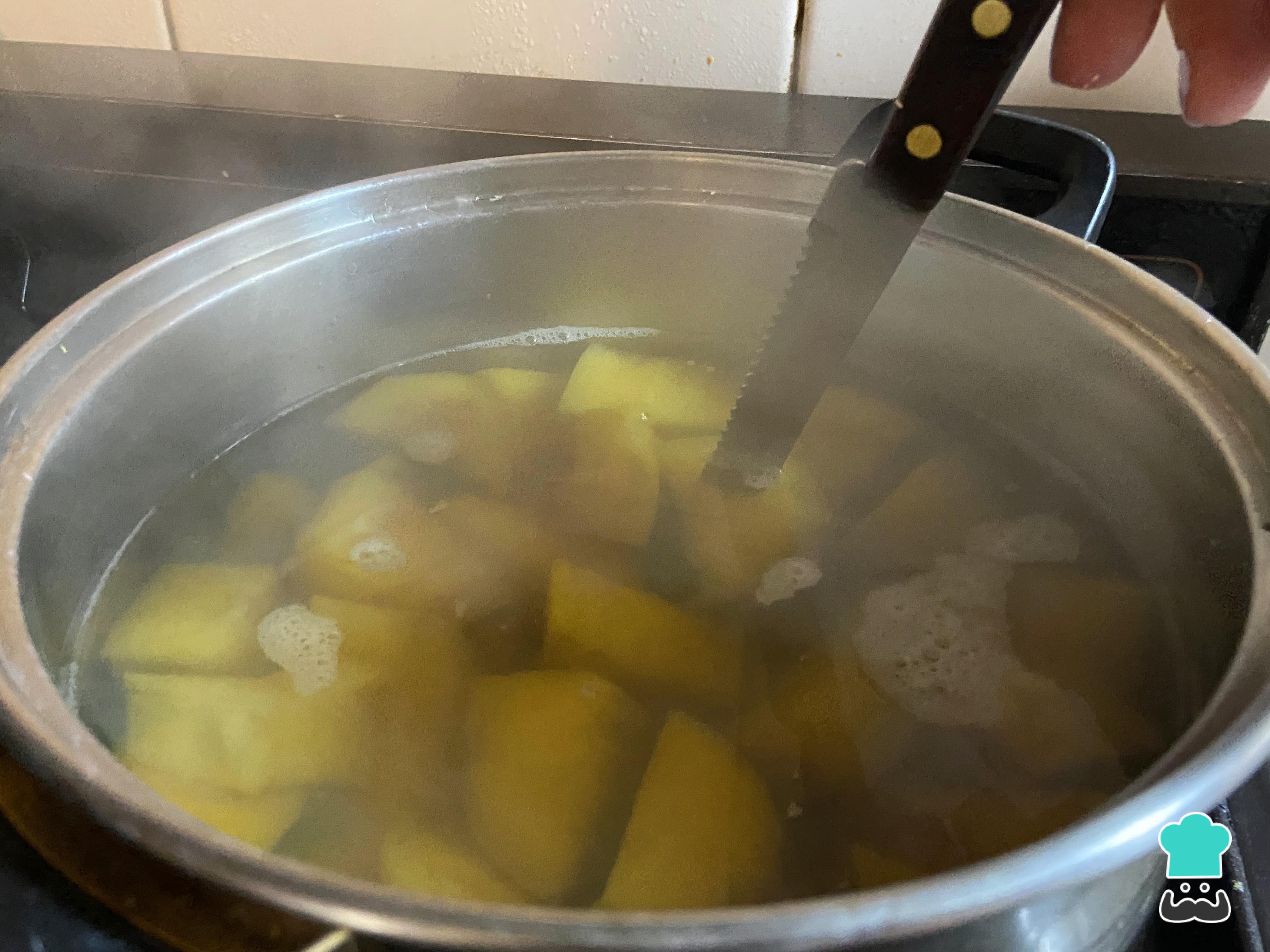 Cocina las batatas en abundante agua hirviendo durante 10 minutos o hasta que, al pincharlas, se caigan del tenedor o cuchillo.