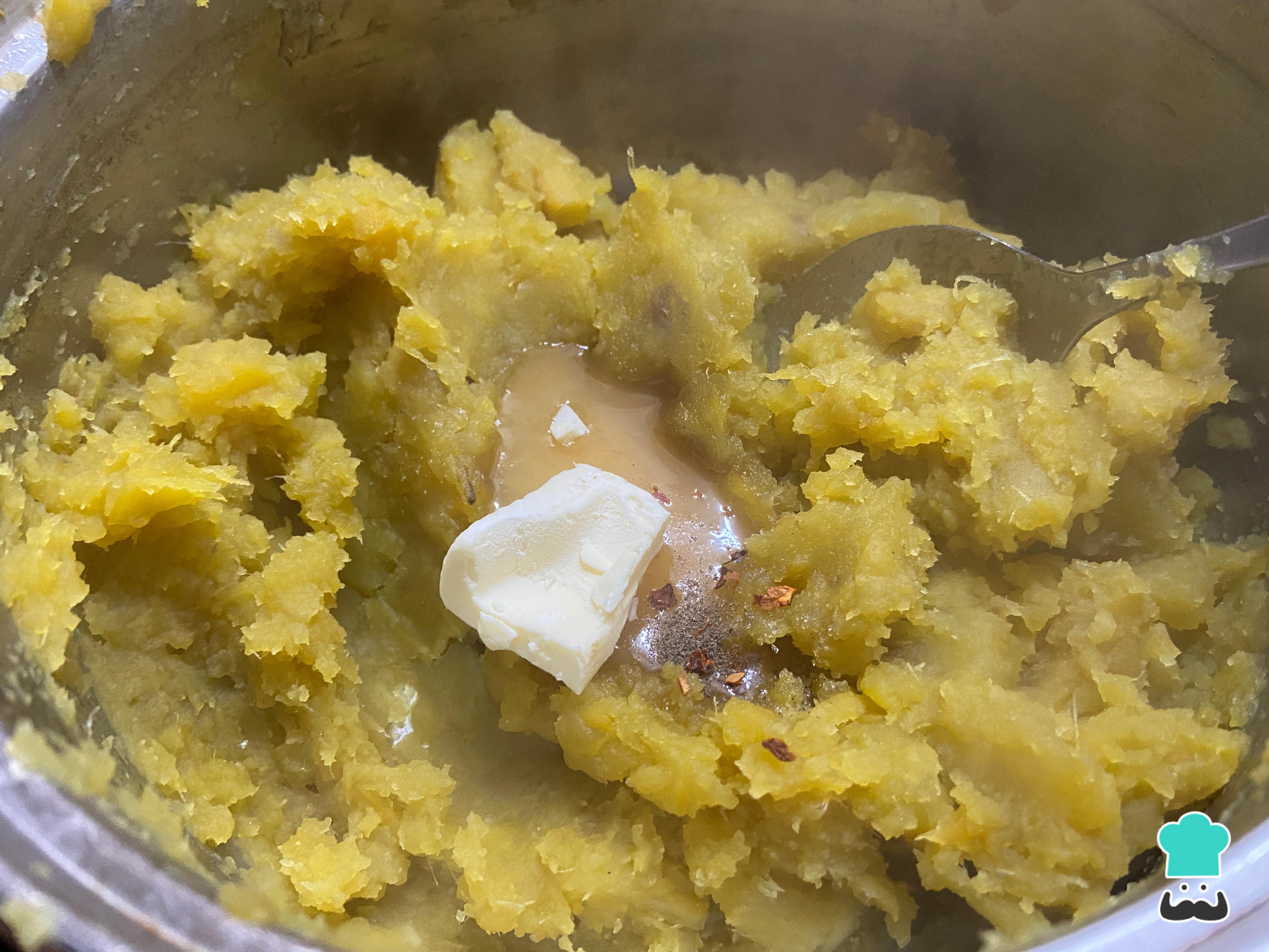 Pisa las batatas cocidas y condiméntalas con la miel, la manteca y la pimienta. Puedes reemplazar la manteca por crema u obviarlas por sus calorías y reemplazarlas por leche. Lo dejamos a tu gusto.