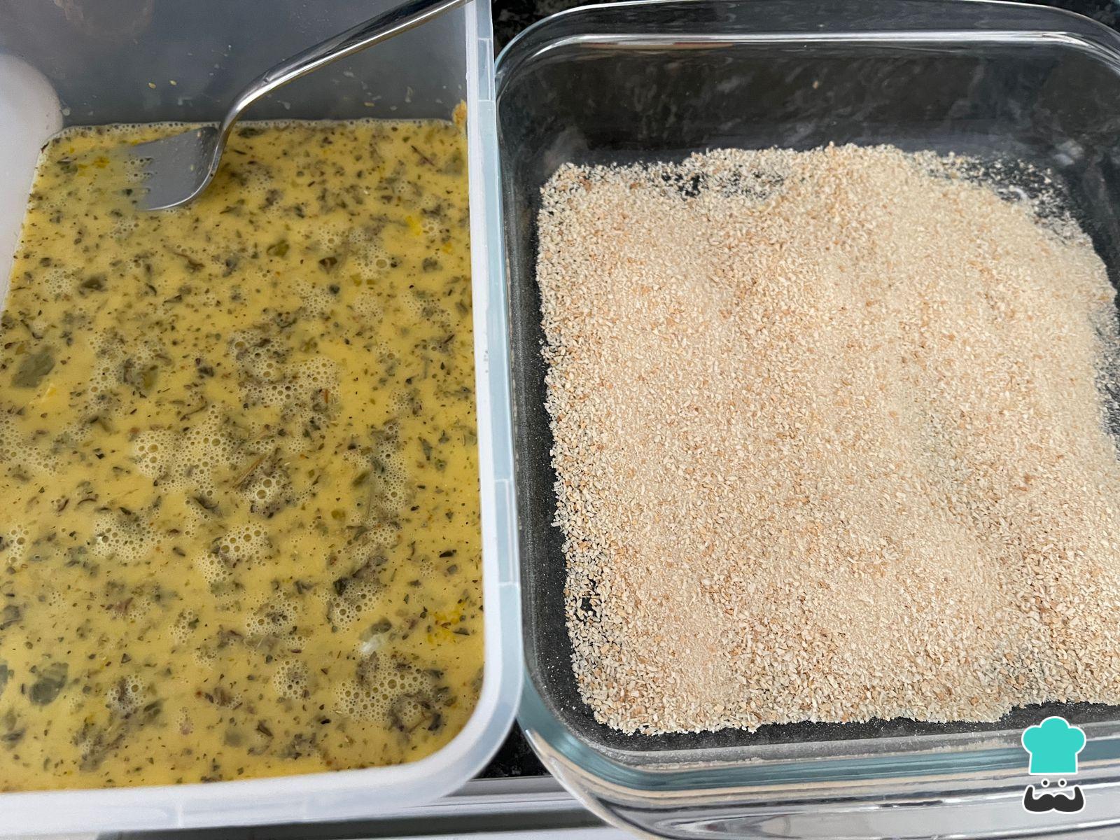 Mezcla el huevo con la leche y la mostaza o los condimentos que más te gusten en un recipiente hondo. Puedes optar por provenzal fresca o seca, albahaca, perejil, orégano, etc. Por otro lado, dispón el pan rallado en otro recipiente amplio y hondo. Aquí también puedes jugar con distintas combinaciones, pan rallado y avena, copos de maíz sin azúcar triturados, semillas, panko.
