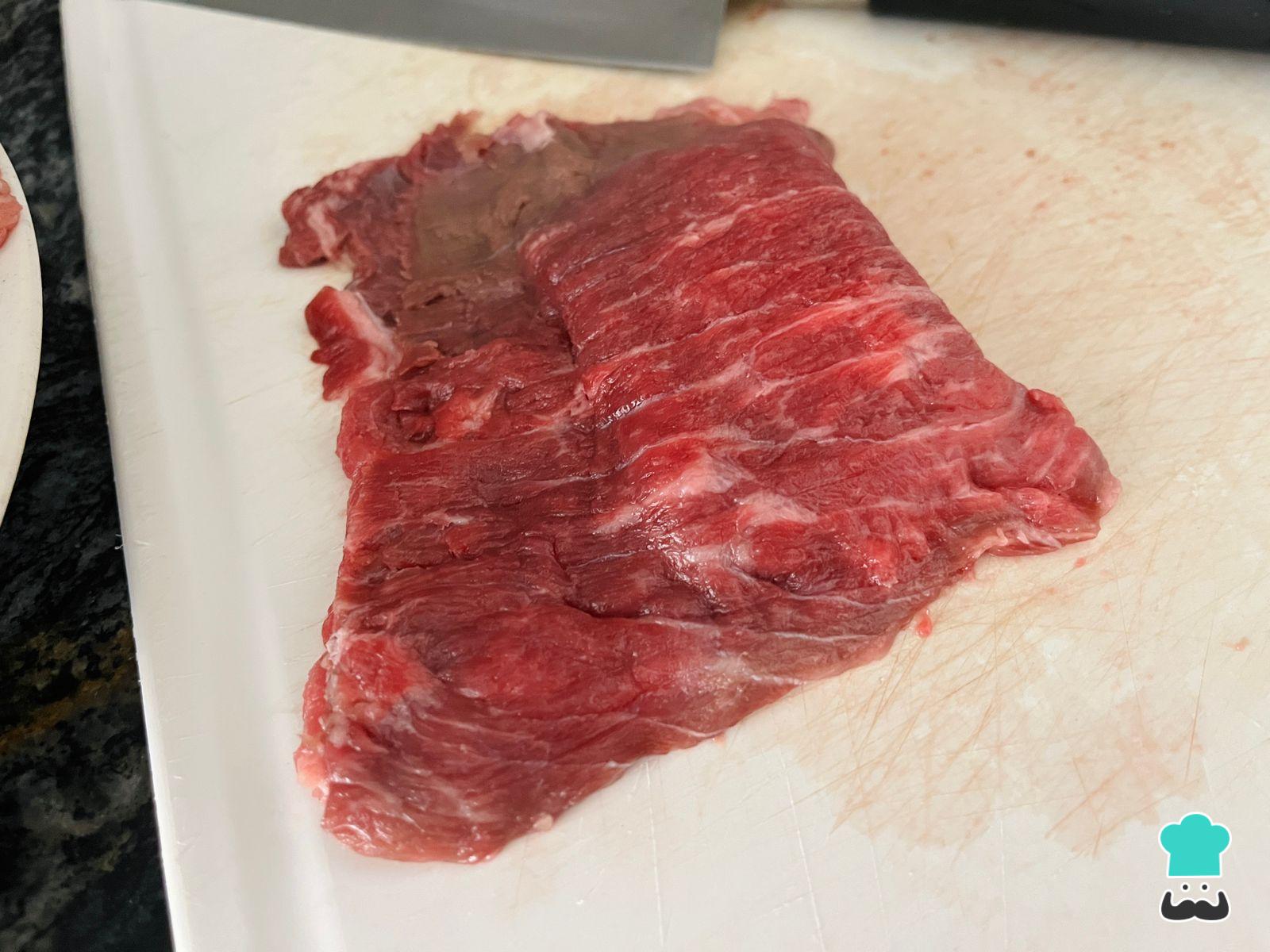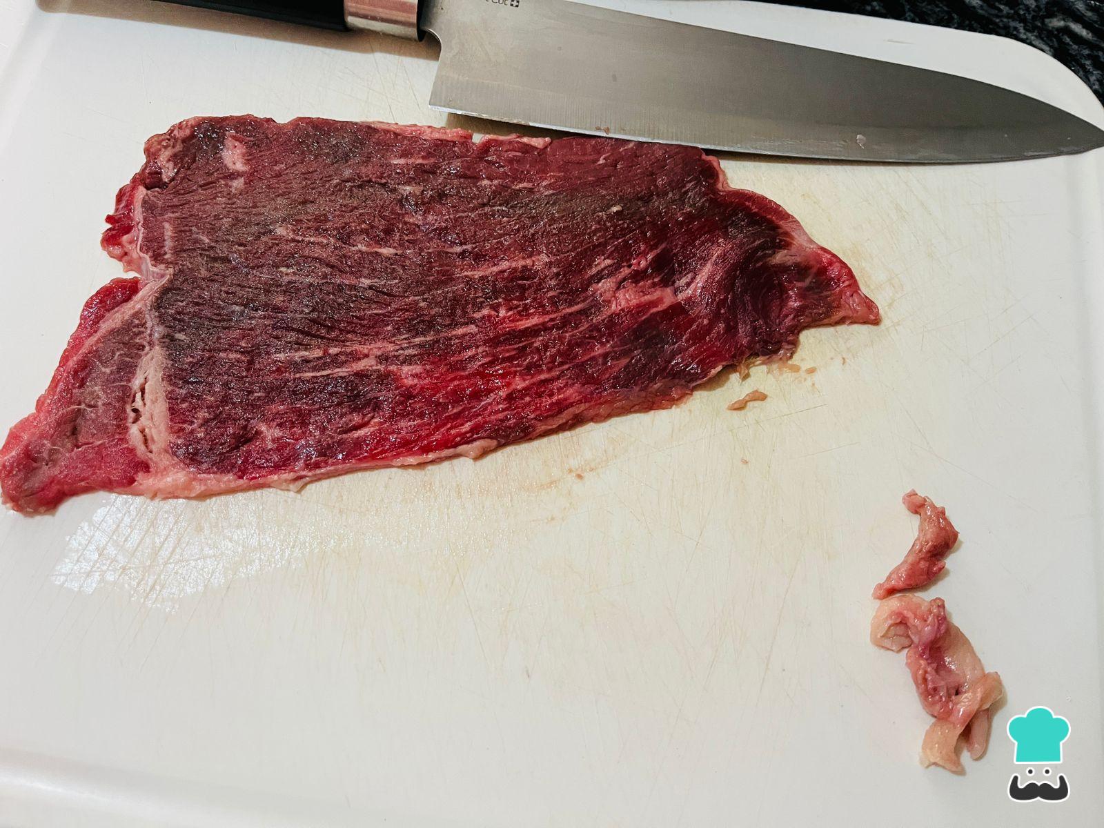 Retira de cada emincé de carne la grasa visibleo nervios para que sea amena al masticar.