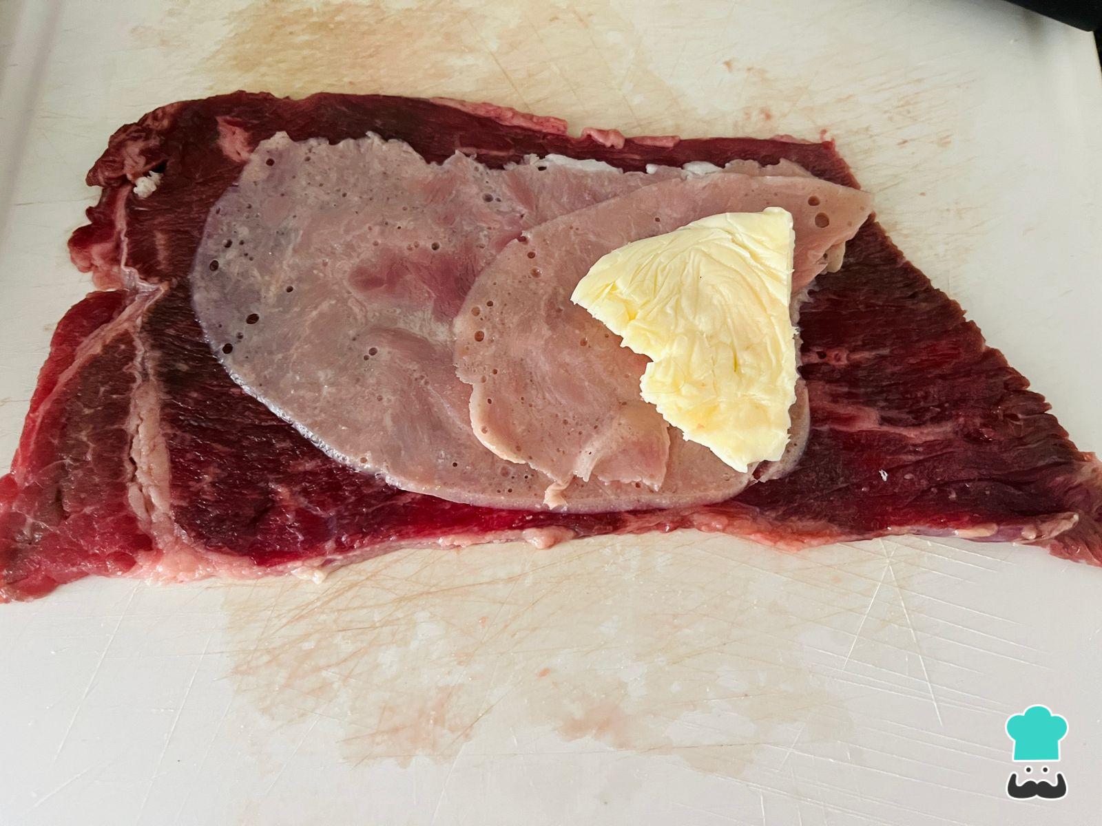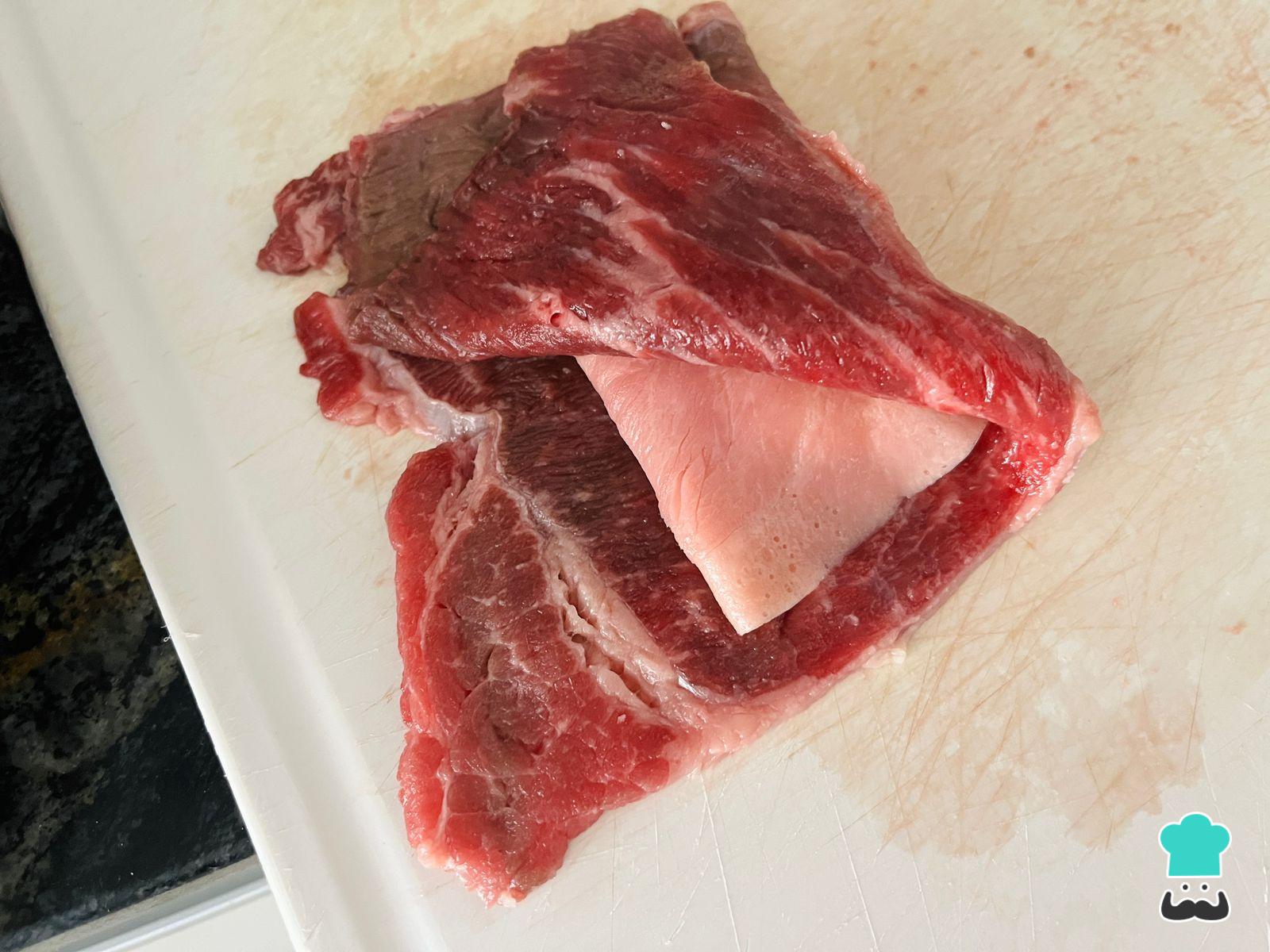 Recomendamos envolver el queso en las lonchas de jamón para que lo contengan mejor y no se escapen del relleno de la milanesa. Ubícalo en una de las mitades del emincé de carne y ciérralo como si fuera un libro, asegurándote que los borden queden parejos.