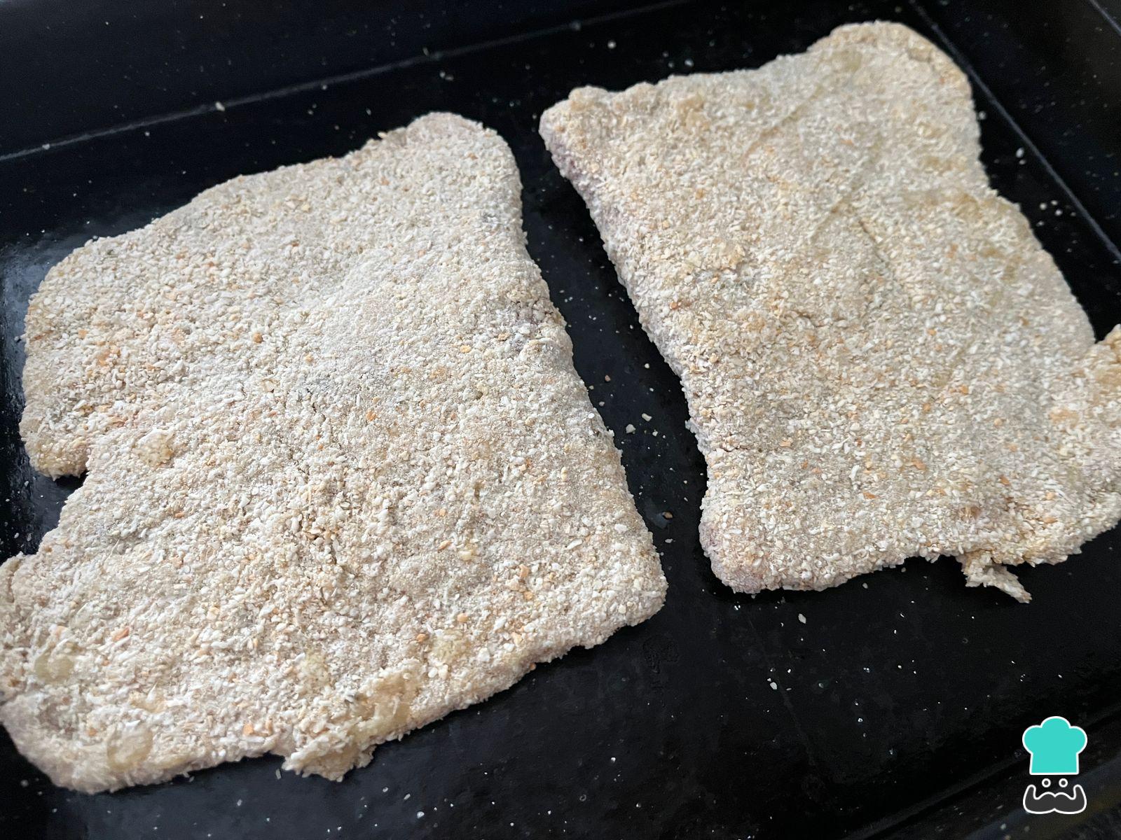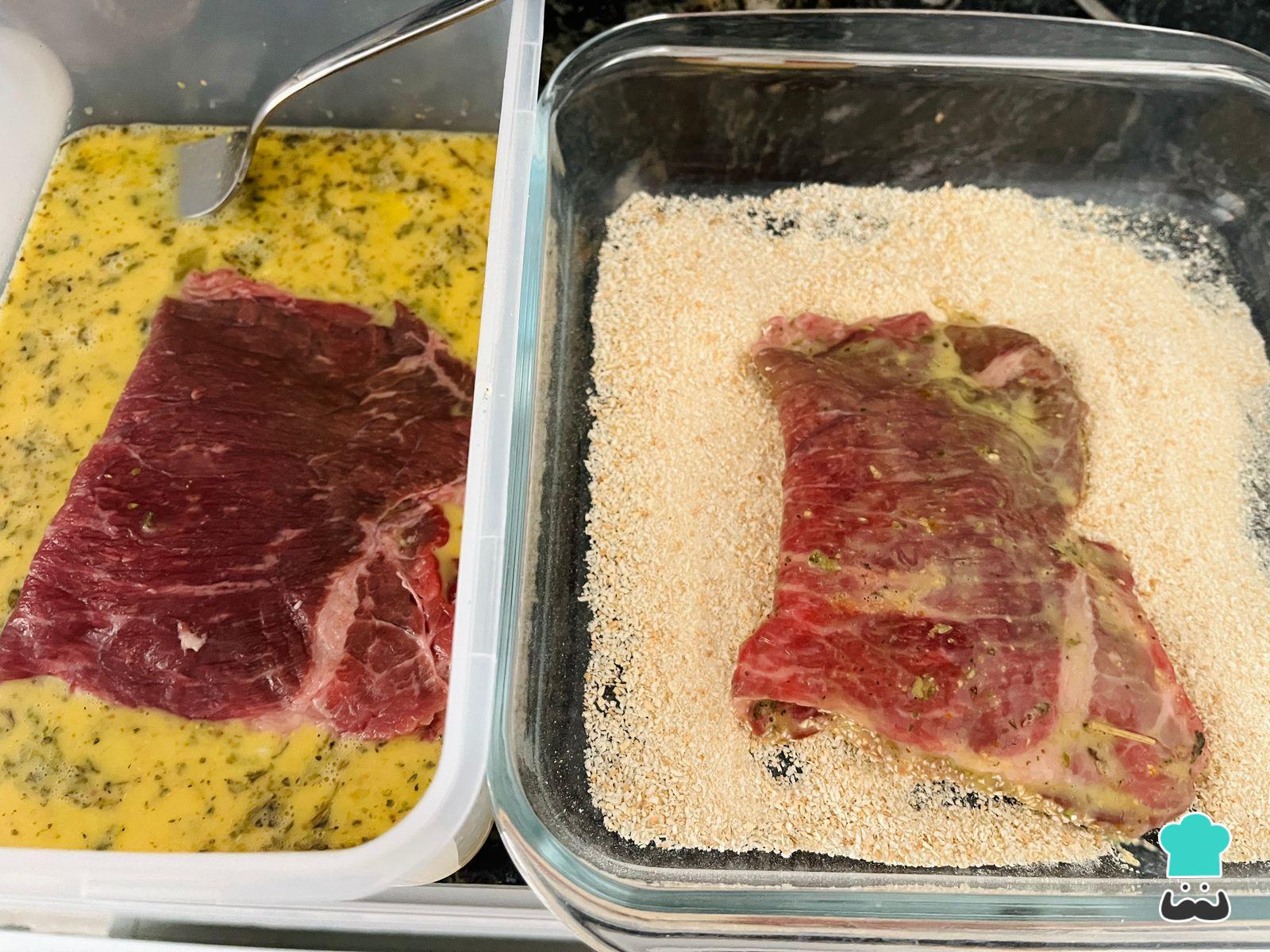 Humedece por todas las partes la milanesa en el huevo batido con el condimento y, luego, pásalo por el pan rallado. Con cuidado, haz algo de presión para que el pan rallado se pegue y repite, para hacer un doble rebozado y que el relleno quede más asegurado en el centro.