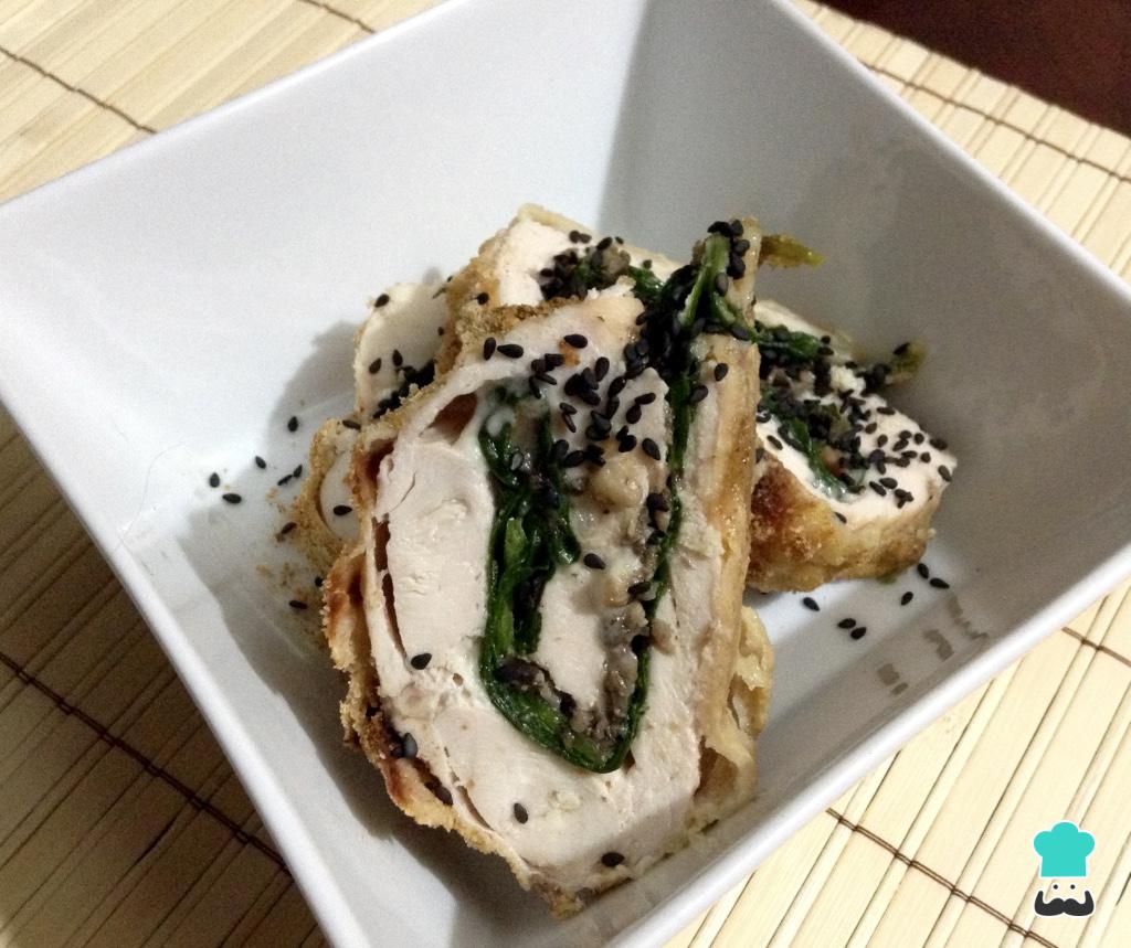 Cuando las milanesa de pollo rellenas de champiñones estén tibias, córtalas en medallones y sirve decorando cada plato con un poco de sésamo espolvoreado por encima.