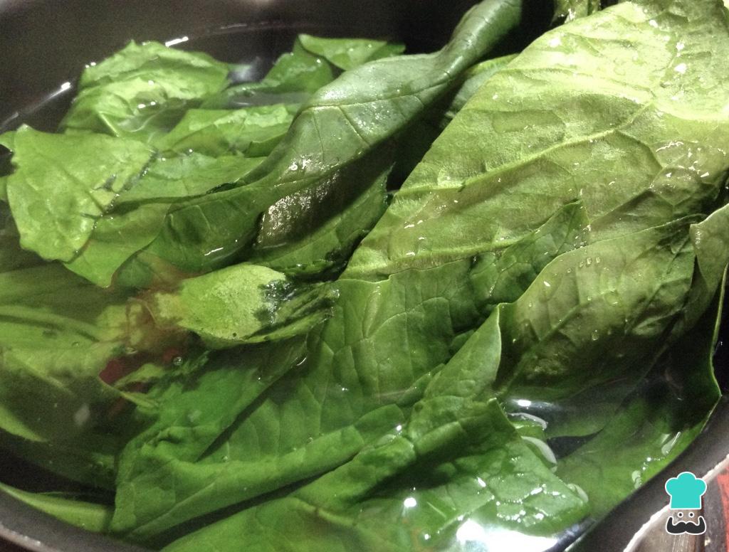 Lleva una olla honda con agua a fuego medio y, cuando hierva, cocina las hojas de espinacas durante 30 segundos aproximadamente. Retira la verdura del agua y corta la cocción con agua fría.