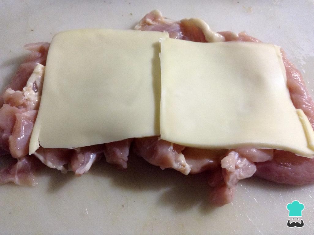Estira las pechugas de pollo deshuesadas sobre tu superficie de trabajo, coloca el queso mozzarella encima, tal y como se observa en la fotografía.