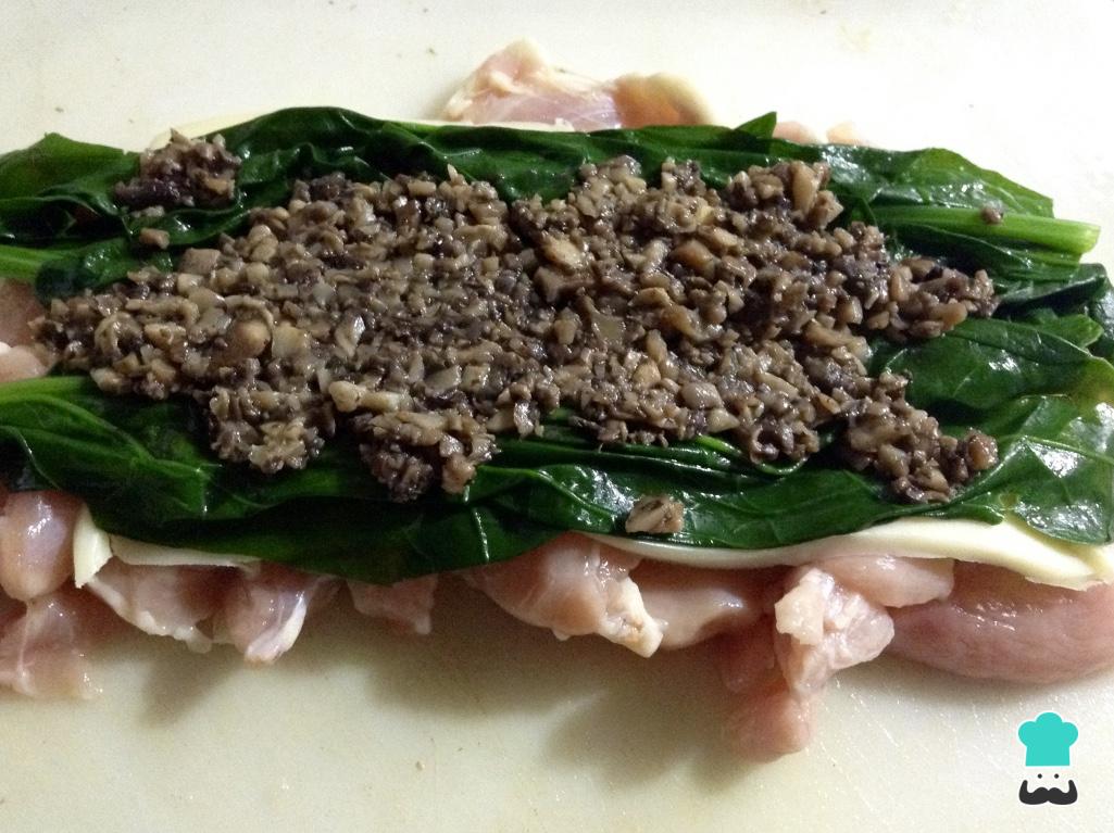 Agrega las espinacas cocinadas y los champiñones salteados sobre el queso para continuar con la preparación de las milanesas de pollo rellenas. Aunque nosotros hemos incorporado espinacas y queso al relleno, si quieres, puedes modificar la receta y emplear otros ingredientes. En tal caso, no dudes en escribirnos para contarnos cómo has hecho las milanesas.