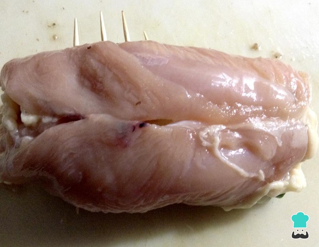 Enrolla con mucho cuidado las milanesas de pollo, agrega sal y pimienta al gusto. Ciérralascon palillos de madera para evitar que se abran durante la cocción.