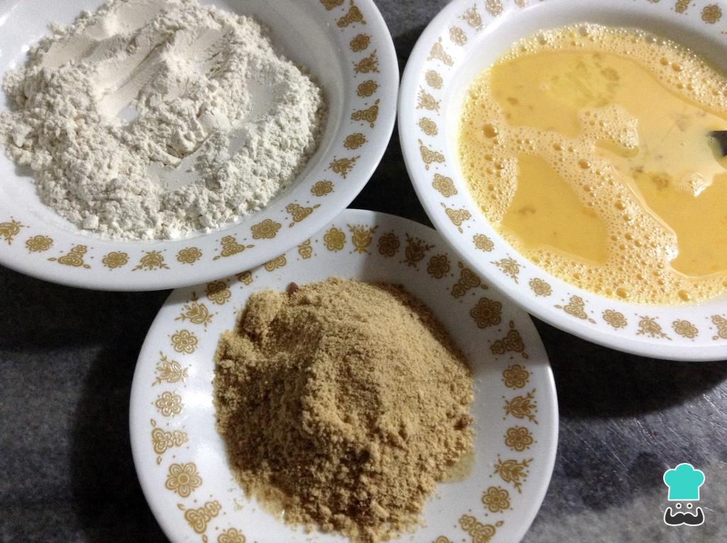 Ahora prepara los ingredientes para el rebozado de las milanesas. Hecho esto, para rebozarlas deberás pasarlas primero por la harina de trigo, luego por los huevos batidos y, por último, por la miga de pan.