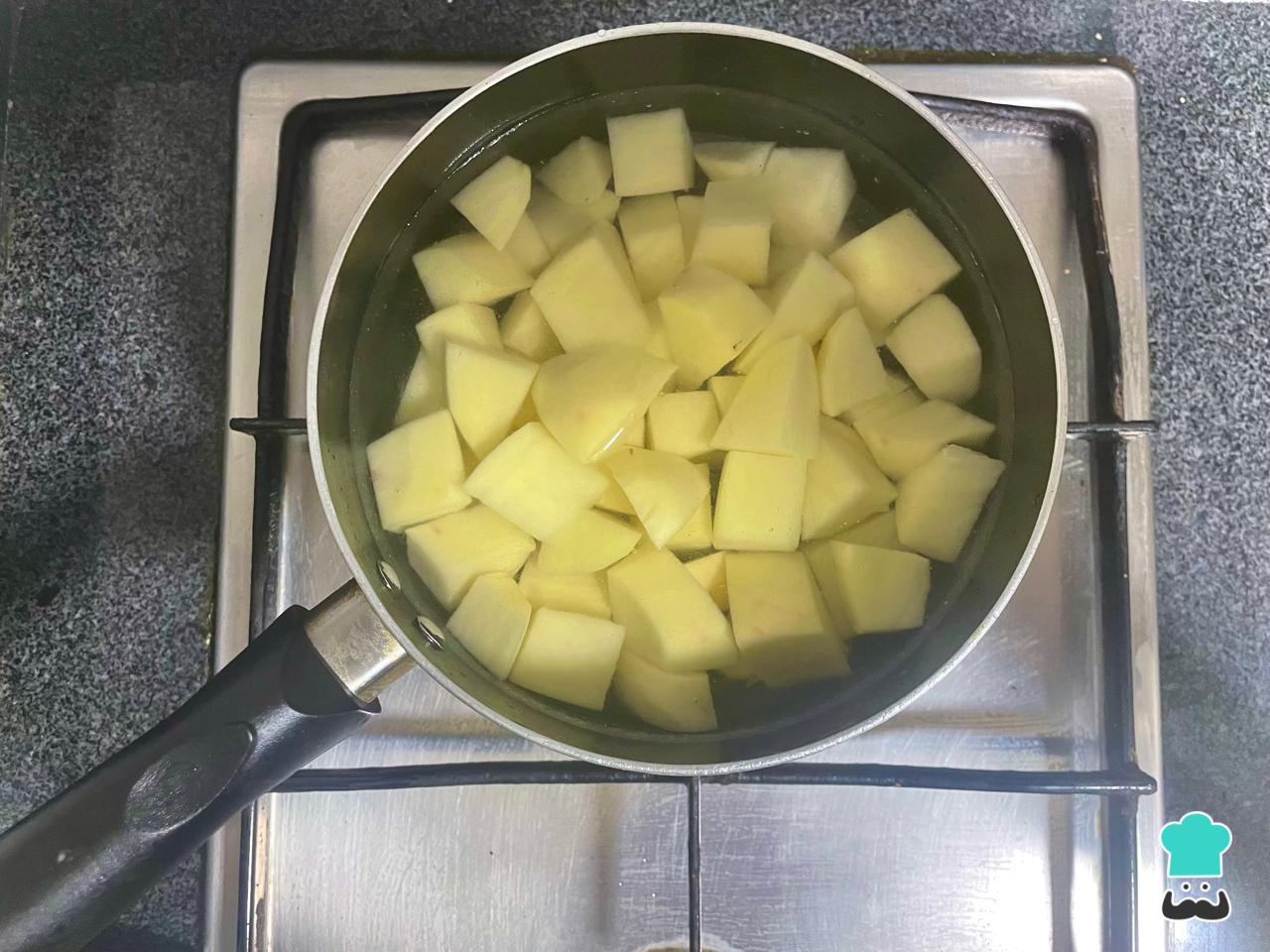 Pela las mitad de las papas y corta en trozos grandes, colocalas en una olla grande con agua y una pizca de sal. Cocina a fuego medio-alto hasta que las papas estén blandas pero no deshechas, aproximadamente 20-25 minutos.