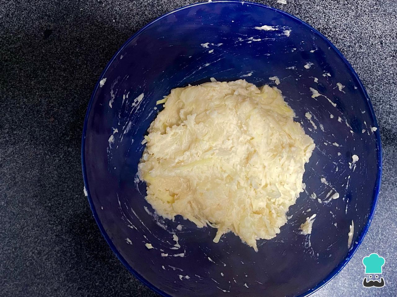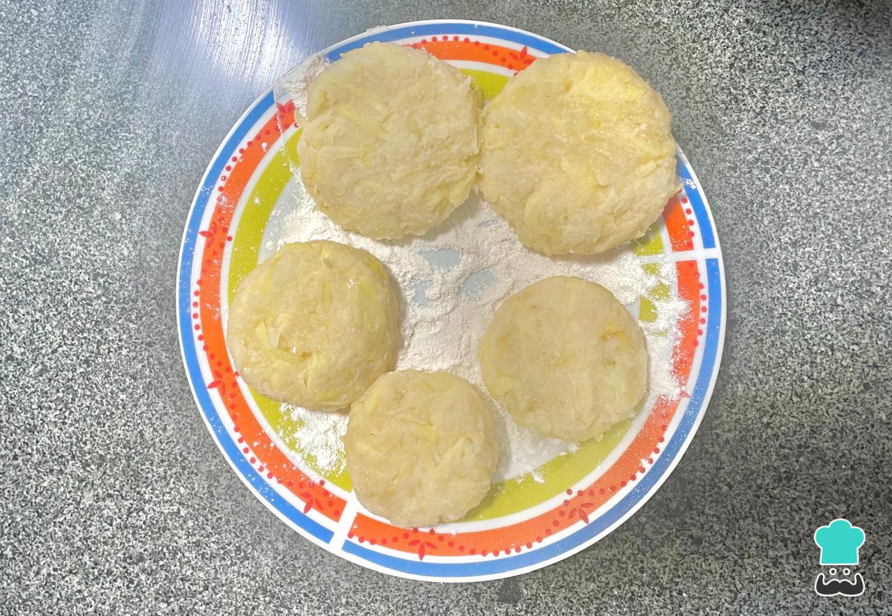 Escurre las papas cocidas y aplasta con un tenedor hasta obtener un puré sin grumos. Con la otra mitad de las papas pela y ralla, mezcla para formar una masa.