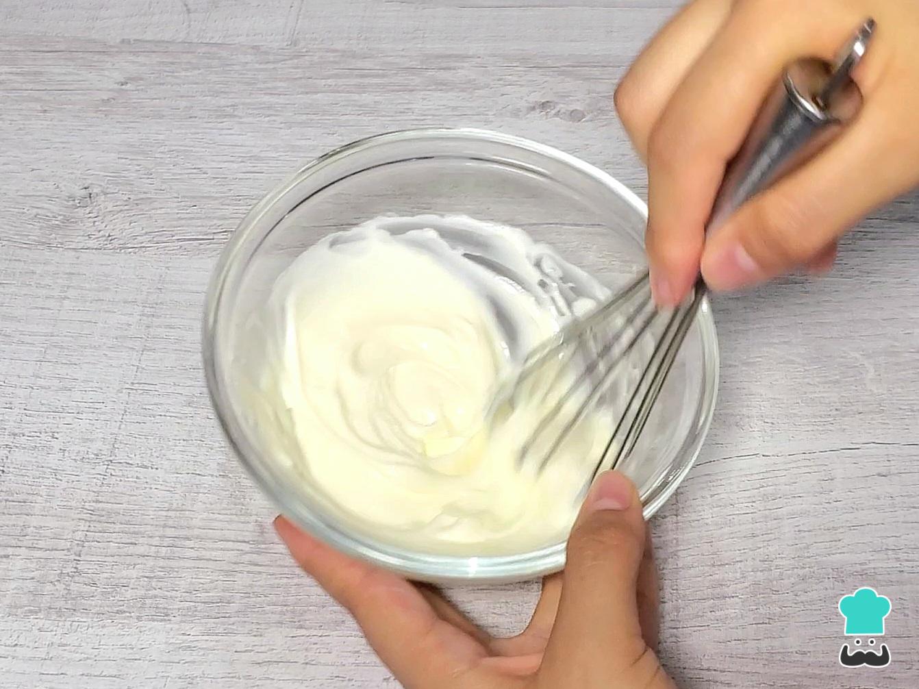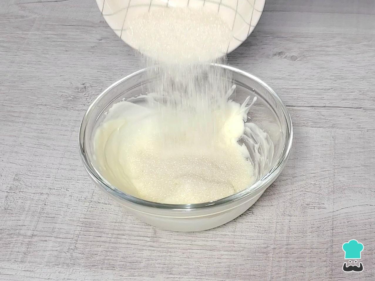 Usa un batidor de globo para batir el queso crema hasta obtener una consistencia untable. Luego, añade el azúcar y bate bien hasta que la mezcla esté cremosa.