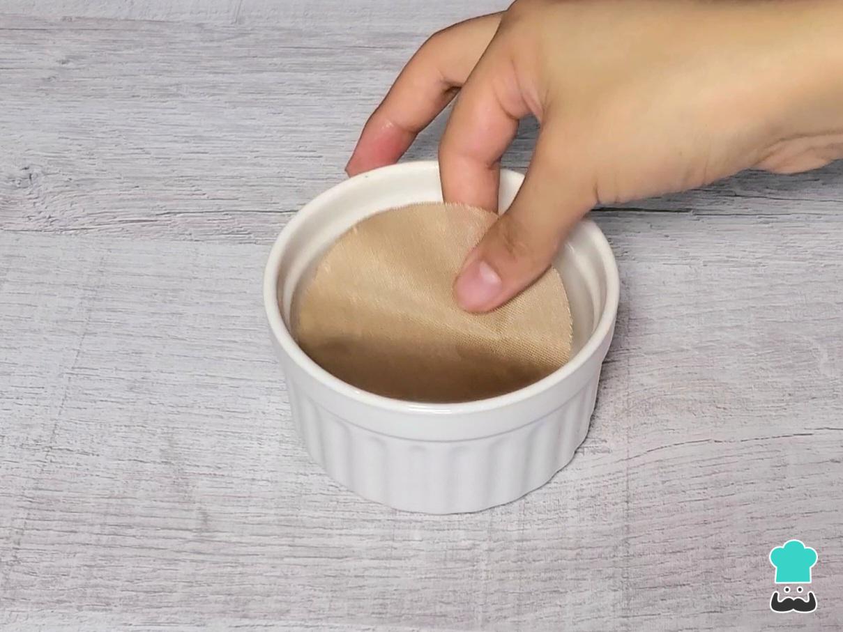 Enmantequilla un recipiente apto para microondas; puede ser de cerámica o vidrio templado, siempre que resistan altas temperaturas. Además, para facilitar el desmoldado, coloca un disco de papel manteca en la base.