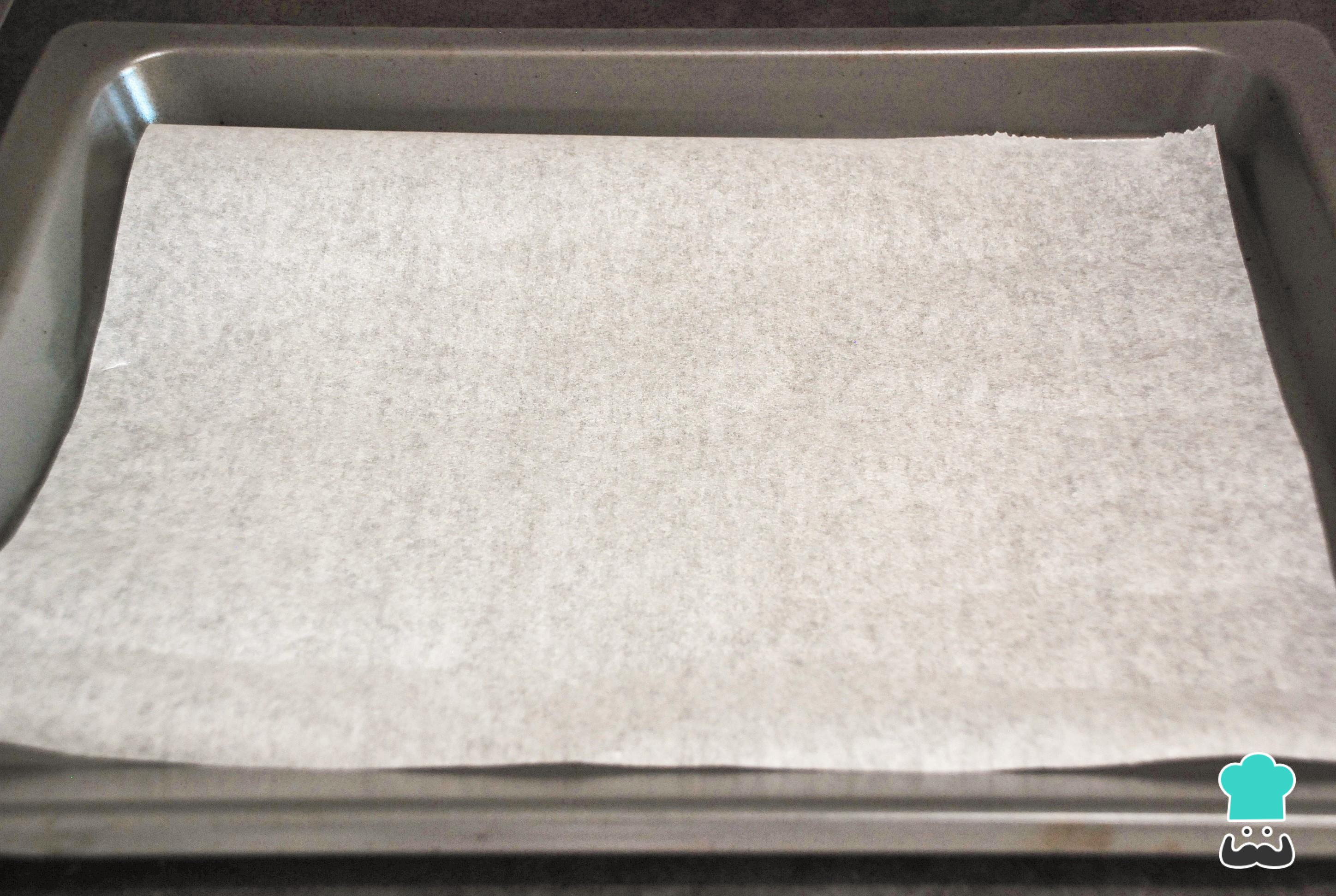 Para empezar a preparar las mini pizzas lo primero que tienes que hacer es precalentar el horno a 180ºC y forrar la bandeja del horno con papel especial. Así evitaremos dañar la bandeja y que las pizzas se peguen.