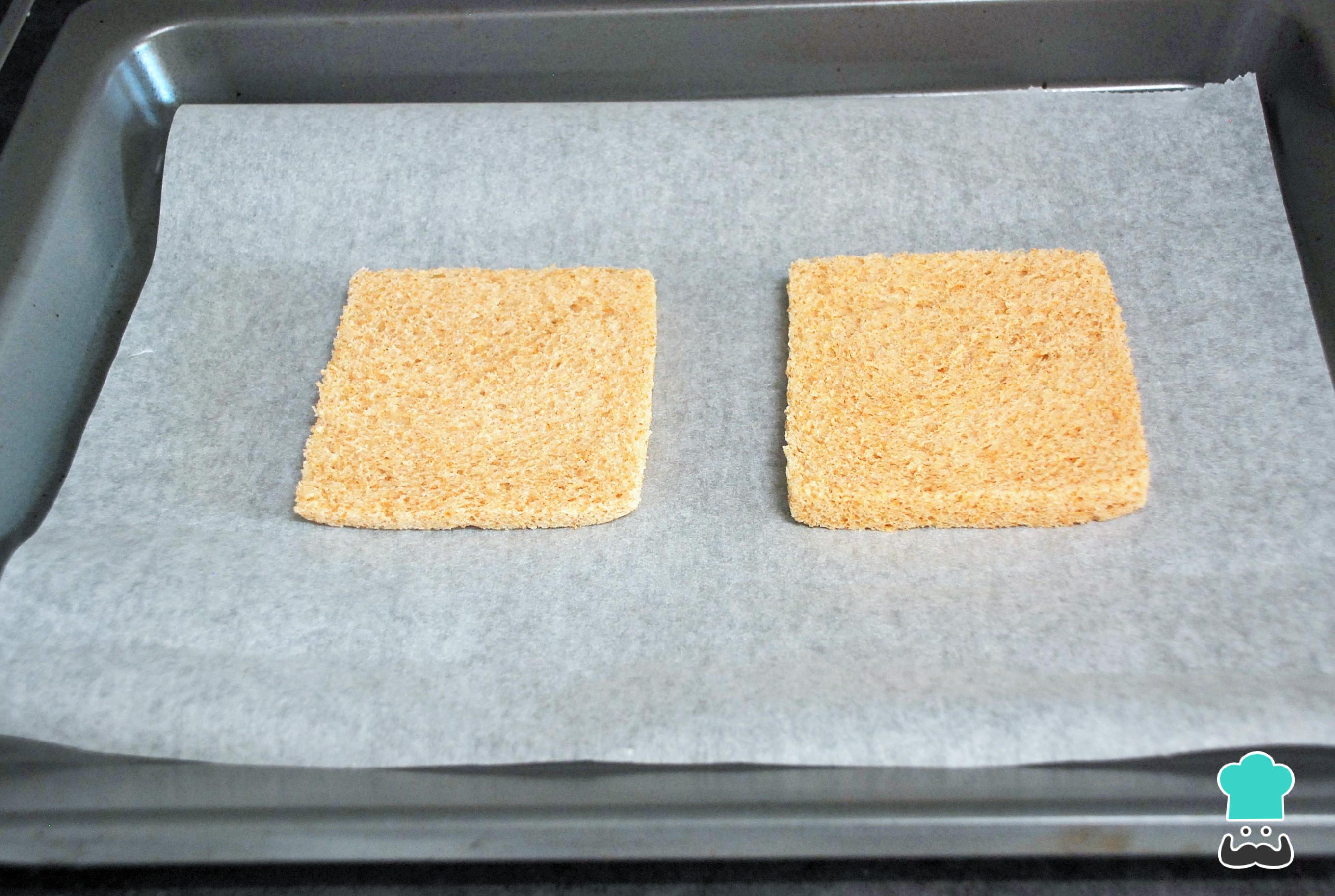 Coloca el pan de molde en la bandeja. Si quisieras hacer mini pizzas para más personas es importante que dejes una separación de 5 centímetros entre cada rebanada.