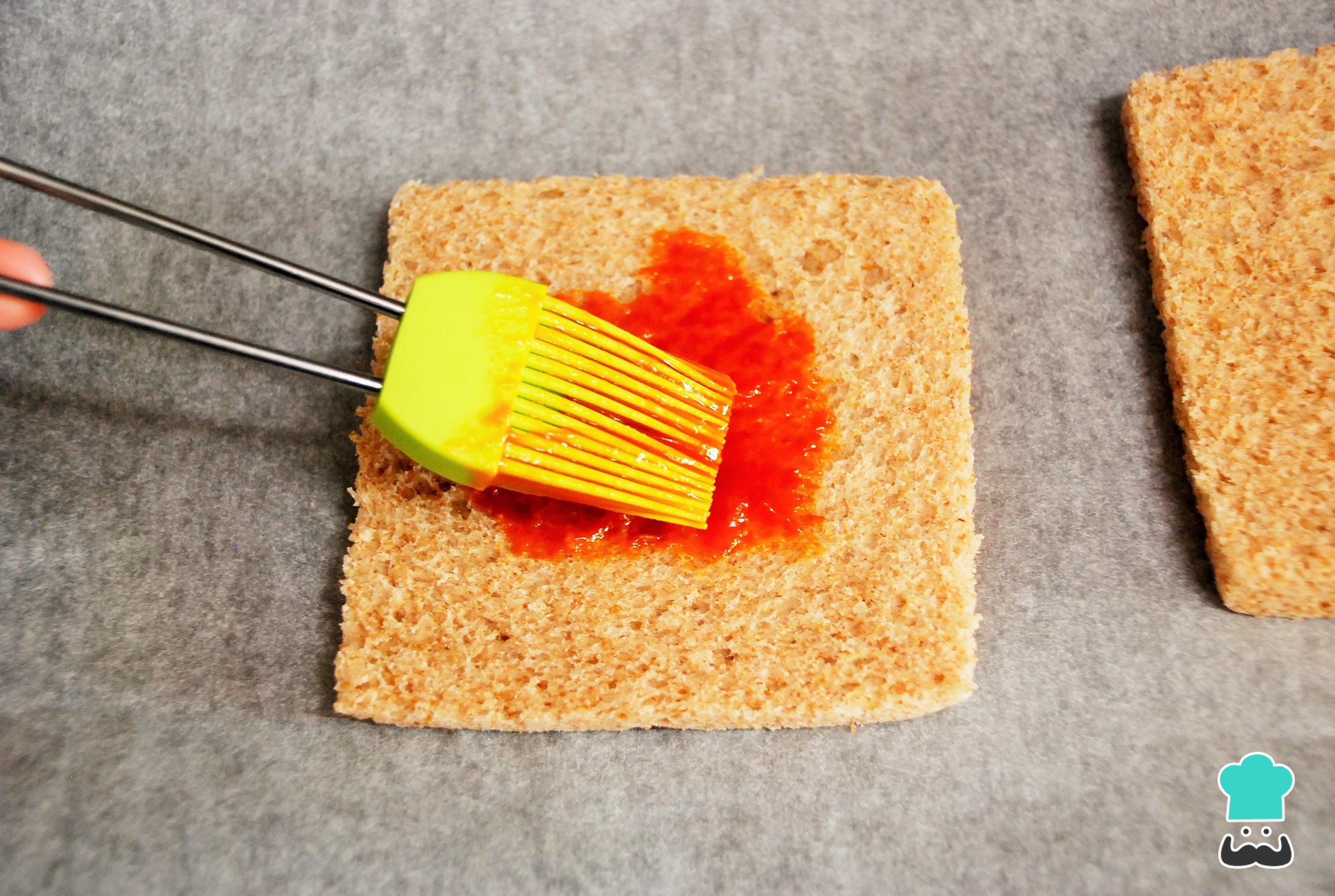 A continuación, cubre con la salsa las rebanadas de pan. Utiliza una espátula o una brocha de cocina para que te sea mucho más fácil. Puedes sustituir el tomate frito por una salsa casera de tomate.