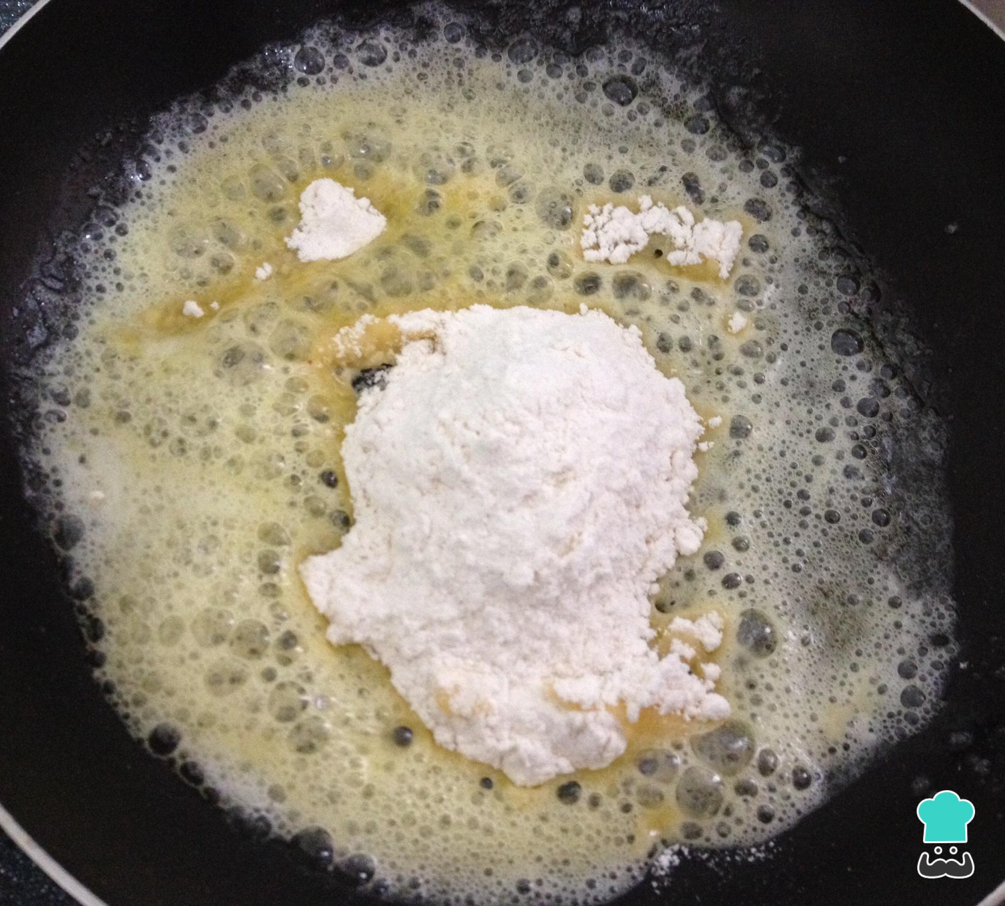 En un sartén derretir la mantequilla y añadir la harina, mezclar y cocinar a fuego bajo durante 1 minuto.